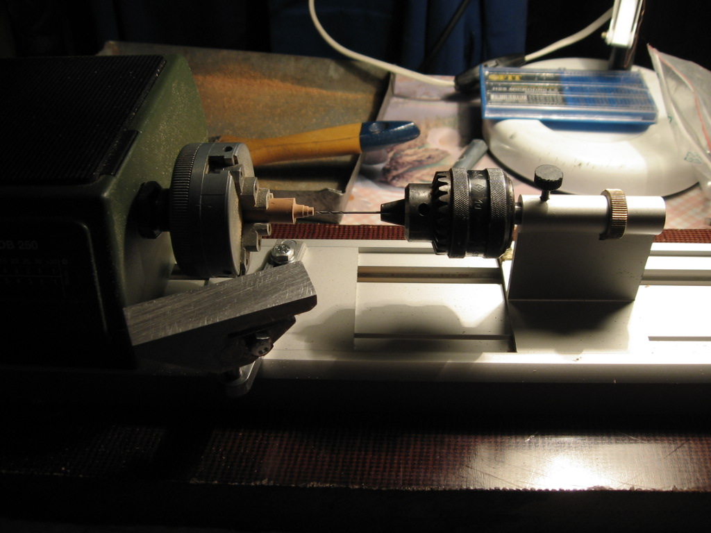 В инструментальных закромах находился без дела сверлильный патрон 0,8-6,0мм. Решил (вместо штатного проксоновского) оснастить им свой любимый токарный станок по дереву PROXXON DB 250. Пороха я тут, конечно не выдумал но, по-моему, получилось весьма удачное дополнение к оснастке станка.