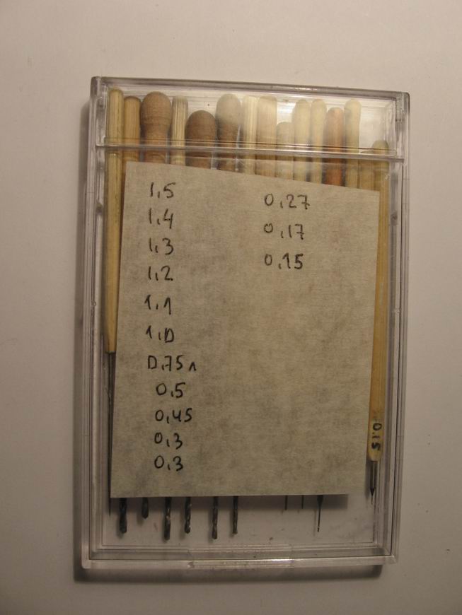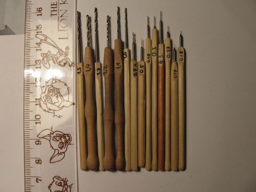 Поэтому для сверл от 1,5мм до 0,15мм я, потратив пару часов, изготовил на любимом DB-250 деревянные заготовки в которые вставил и вклеил сверла нужных мне диаметров.