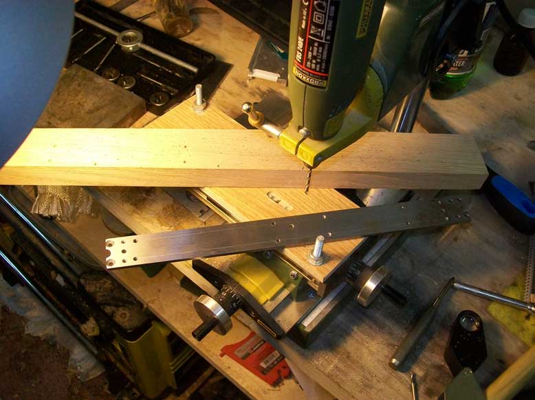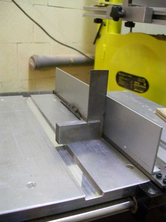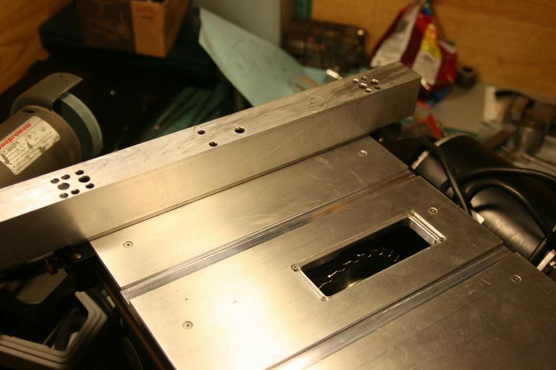 Открутил планку параллельного упора, разметил, просверлил, нарезал резьбу, поставил на место. В куске дюралевого уголка 10х40х2 просверлил отверстия, прикрутил к планке упора. Опробовал.