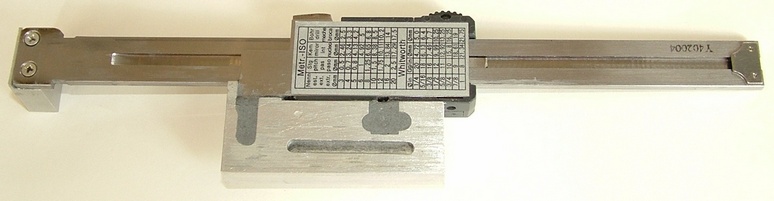 Нашёл этот снимок! Губки стачиваются, на индикатор эпоссидным клеем крепится установочный башмак, который в свою очередь винтом крепится на кожух ходового винта.На линейку ставится колодка \есть проблема со сверлением отверстий в линейке,может быть подкаленая\,которая крепиться на фартук суппорта.