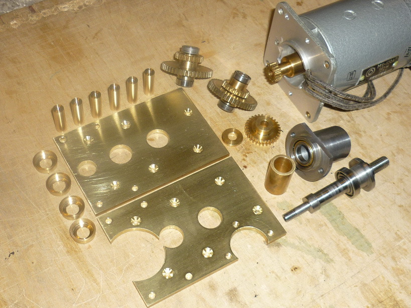 На валу двигателя шестеренка 15 зубьев, редуктор двухступенчатый, промежуточные (большая и малая) по 45 и 20 зубов соответственно, шестеренка на шпинделе 24 зуба, модуль передачи 0,8.