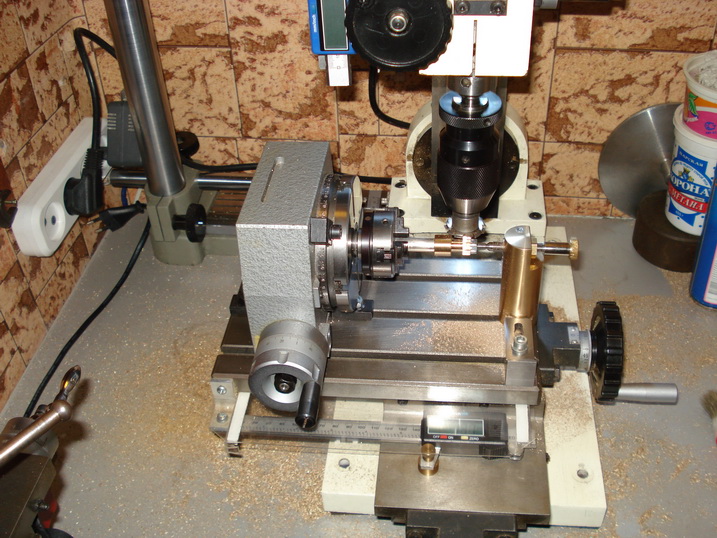 Делительными дисками на поворотный стол пока не обзавелся, поэтому деление производил по лимбу, точность достаточная. В качестве патрона-патрон от делилки "Проксон", сделал переходник из втулки КМ2 под резьбу М12х1.
