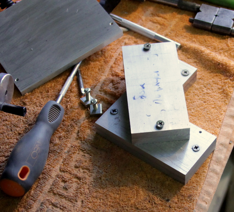 , но у меня твёрдое убеждение , что настоящий станок должен быть из метала !Итак проблема номер раз ! Мне надо получить несколько одинаковых деталей ( боковины корпуса и боковины авто подачи) , с посадочными отверстиями под подшипники . Я не металист и не знаю какие должны быть допуски , но понимаю , что в подшипниках люфта нет и значит соосность должна быть ну ОЧЕНЬ точная ! Наверное самый точный мой станок , это сверлильная станина с микромотом и координатным столом . Но просверлить на нём отверстия даже всего лишь диаметром в 2,5 мм в дюрали это уже проблема - мощи мало . Но стараемся сверлим потихоньку . Итак две почти одинаковые детали , нарезанные на циркулярке для дсп , скручиваем струбциной и сверлим пару тройку сквозных отверстий , потом нарезаем в них резьбу и стягиваем винтами . И идём на следующий станок для обработки дерева - ленточная шлифовалка .