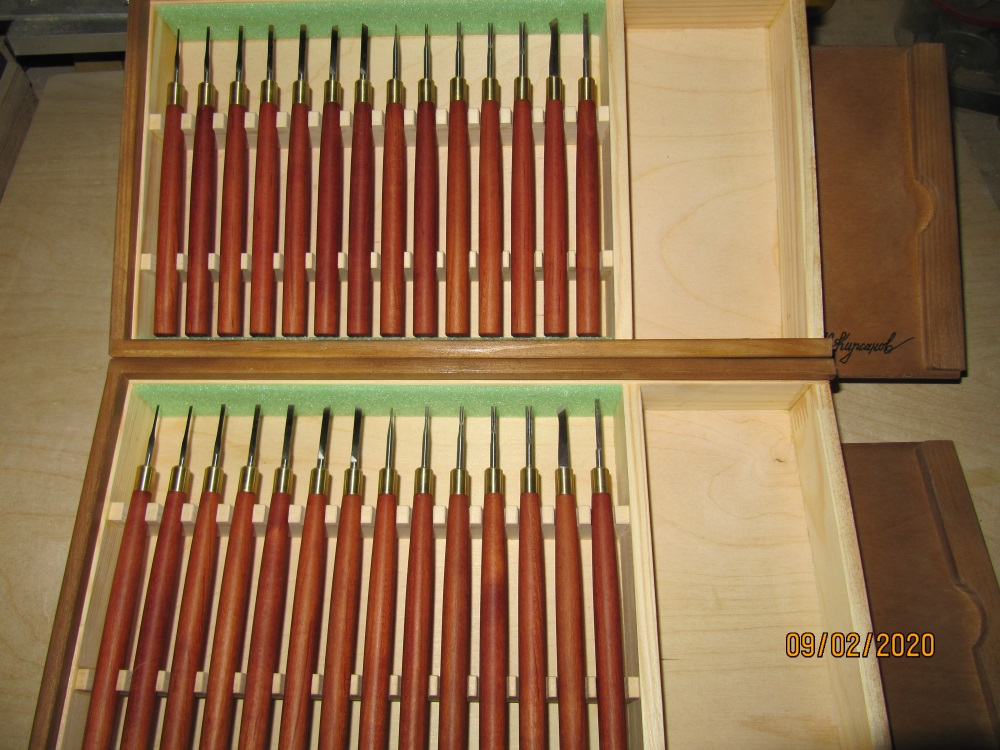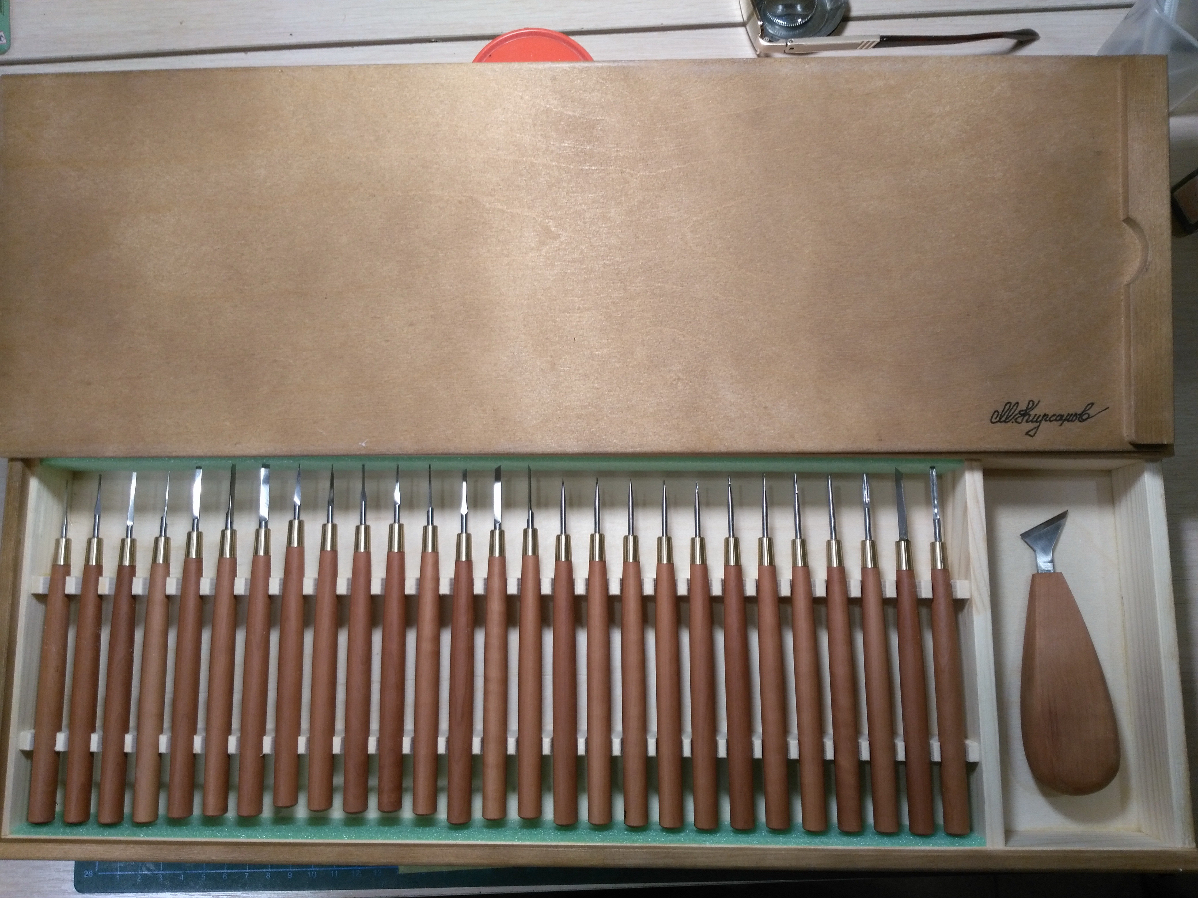 У меня уже накопилось достаточное количество резцов от Михаила, коробки в работе неудобны, а использую в работе только эти резцы, ну и скальпель в качестве дополнения. Для такого идеального инструмента придумала держатели. Сначала было все в один ряд, но не все резцы поместились, вчера напечатали второй, теперь почти все на месте