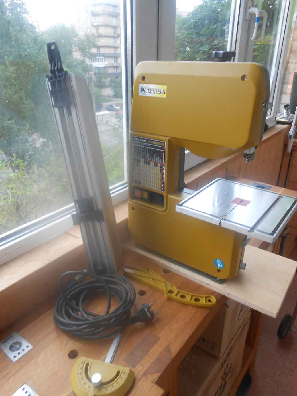 Продам ленточную пилу Proxxon MBS 240 Е. В работе была очень мало буквально пару часов общая наработка. Вылечены все "детские" болезни, как то: установлен нижний опорный узел с подшипниками, устранены люфты колёс, установлены замки-"лягушки" на крышку, установлен разъём сетевого провода, ещё что-то делал, не помню сразу. В комплекте два полотна(от Бибигона - пилят просто отлично), толкатель, поперечный упор-транспортир, параллельный упор (шина Pro Grip 300 мм).