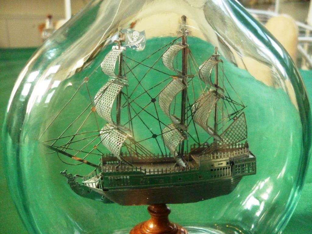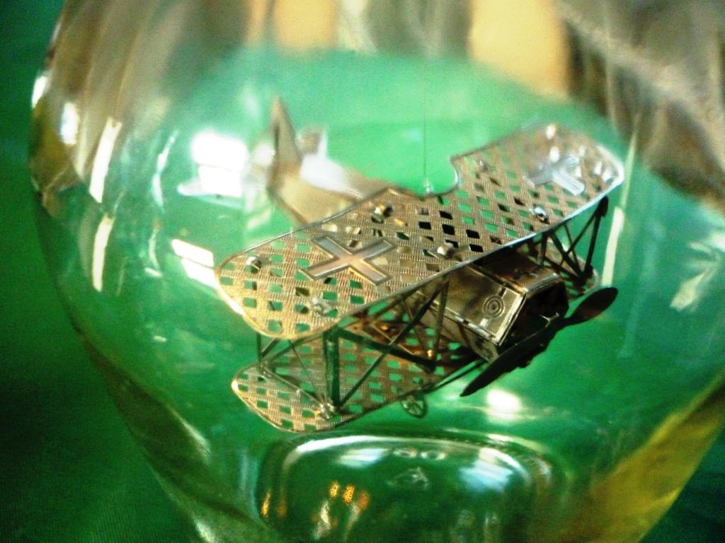 Металлические кораблик и самолетик это китайские собираемые игрушки. Детальки отламываются из пластинок лазерной вырезки, при необходимости изгибаются и собираются в изделие.На столе можно собрать в течении получаса, а вот в бутылке ... Кораблик я собирал недели три (не каждый день, конечно), пришлось придумывать специфический инструмент, методы и пр.