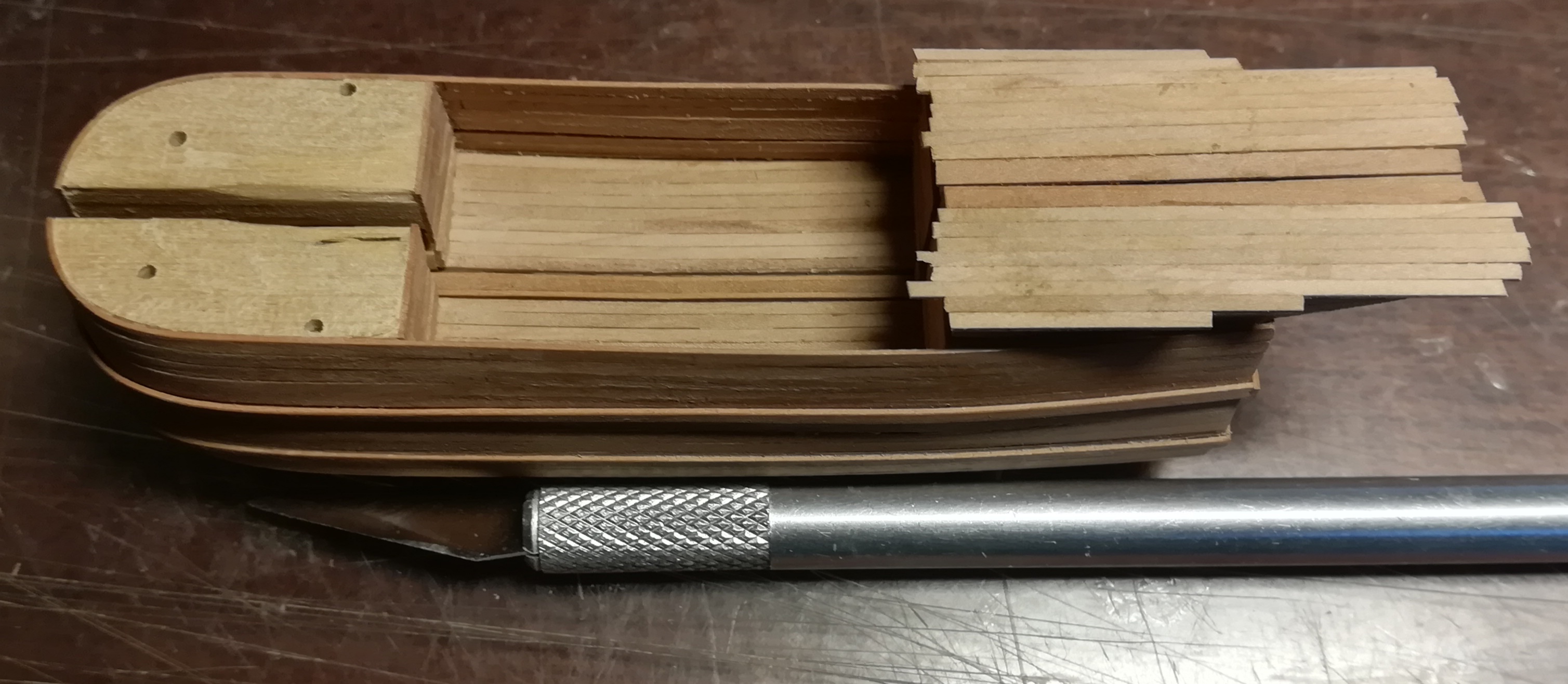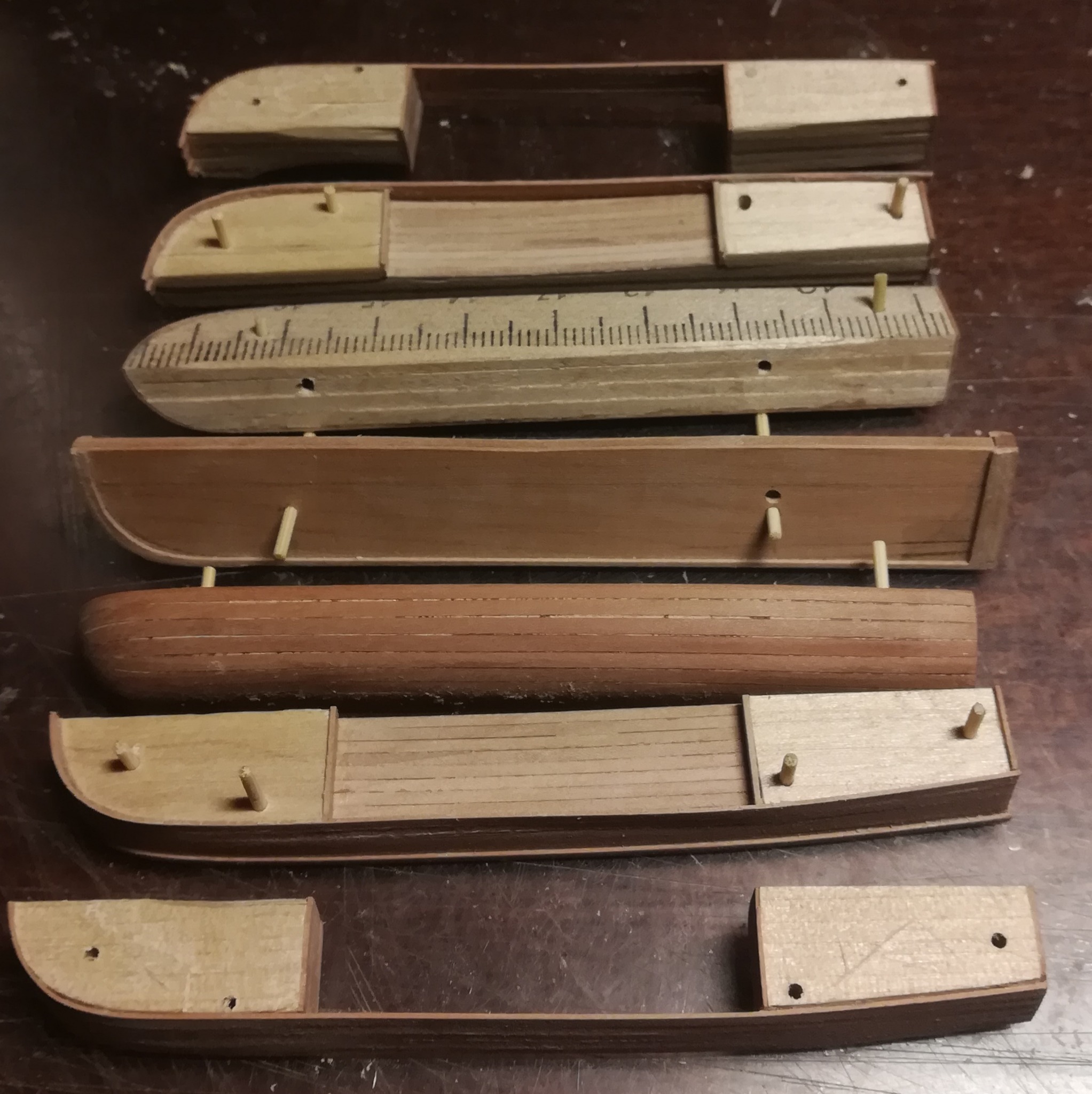 Пришлось изменить немного линии разреза средних и верхних частей корпуса. Обшил четыре верхних части и получилось две