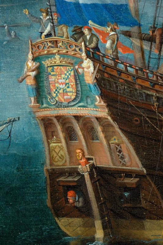 Тут о чем это я - похоже художник нарисовал трофей, прибывшие в Голландию. Зачем дорисовал герб Оранского - хз. Но корабли явно испанской постройки - высоко расположенный батареи, отсутствие резьбы между гальюном и княвдигом, от сутствие львов, как обязательный атрибут голландского судна, высоко расположенный балкон относительно ВЛ и относительно верхушки пера руля - у голландцев подзор невысокий.ApxeoS писал(а): ↑Вс дек 04, 2022 23:51 Да чего там лев, резьбы в целом практически нет. Зато какой огромный герб нарисован на кормовом подзоре, да и сверху на корме под пучком стрел чтобы сомнений не осталось подписано - MAVRYSE, т.е. Мориц. Это и название корабля и одновременно имя Штатгальтера Голландии, Зеландии, Гелдерланда, Гронингена и Оверэйсела. Он же Морис, в современном написании - Maurice, принц Оранский.