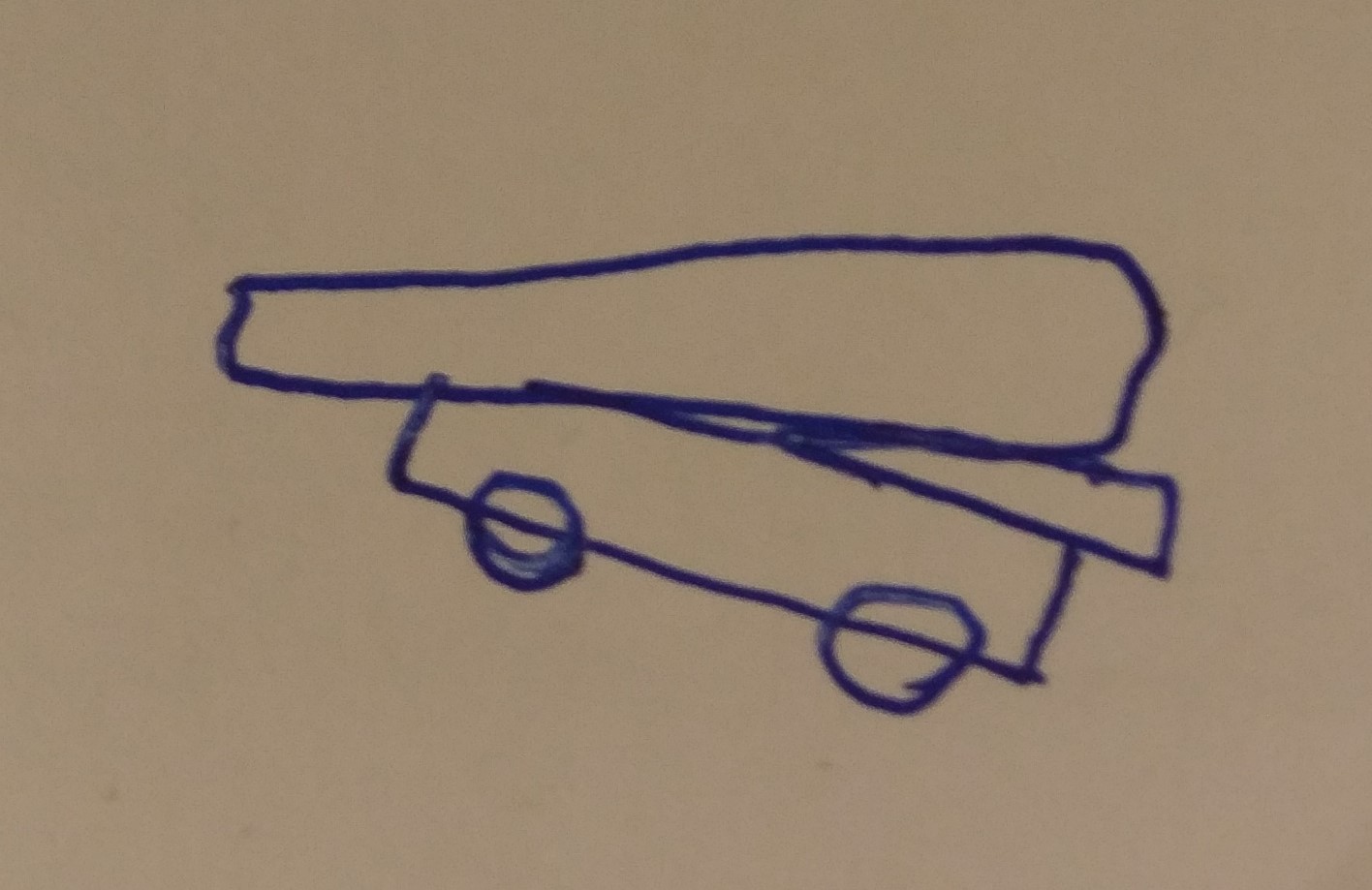 Ну очень условно Надеюсь понятно, что надо использовать не совсем обычный станок, позволяющий снижать ствол, для этого используется увеличенный "треугольник", которым обеспечивали необходимый угол возвышения.Игорь Тараканов писал(а):Можно тебя попросить: нарисуй, пожалуйста, как ЭТО выглядит, накидай эскиз "вид сбоку": ну там палуба, станок, ствол (орудие казнозарядное?) - желательно сразу в двух положениях, полного наката и полного отката. Можно ручкой на листочке и на телефон щелкнуть, я разберусь.