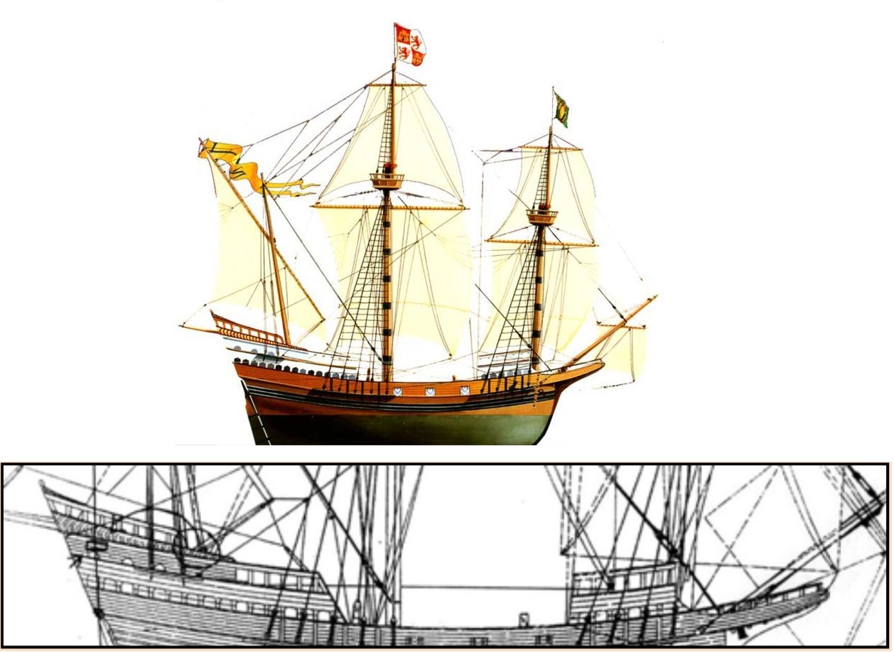 Нижний - не имеет прямых аналогов и больше похож на гибрид представлений об испанском и английском галеонах 2-ой половины 16 века.