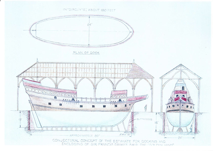 Это действительно работы Раймонда Акера, выполнявшиеся во время исследования остатков сухого дока в Дептфорде, где в 1580 году был размещен для публичного обозрения Голден Хинд . (Результаты должны были появиться в 2012 году в виде остатков Пеликана, которые предполагалось отыскать в остатках давно засыпанного дока, представленных в музее)...Произошло ли это - не скажу...