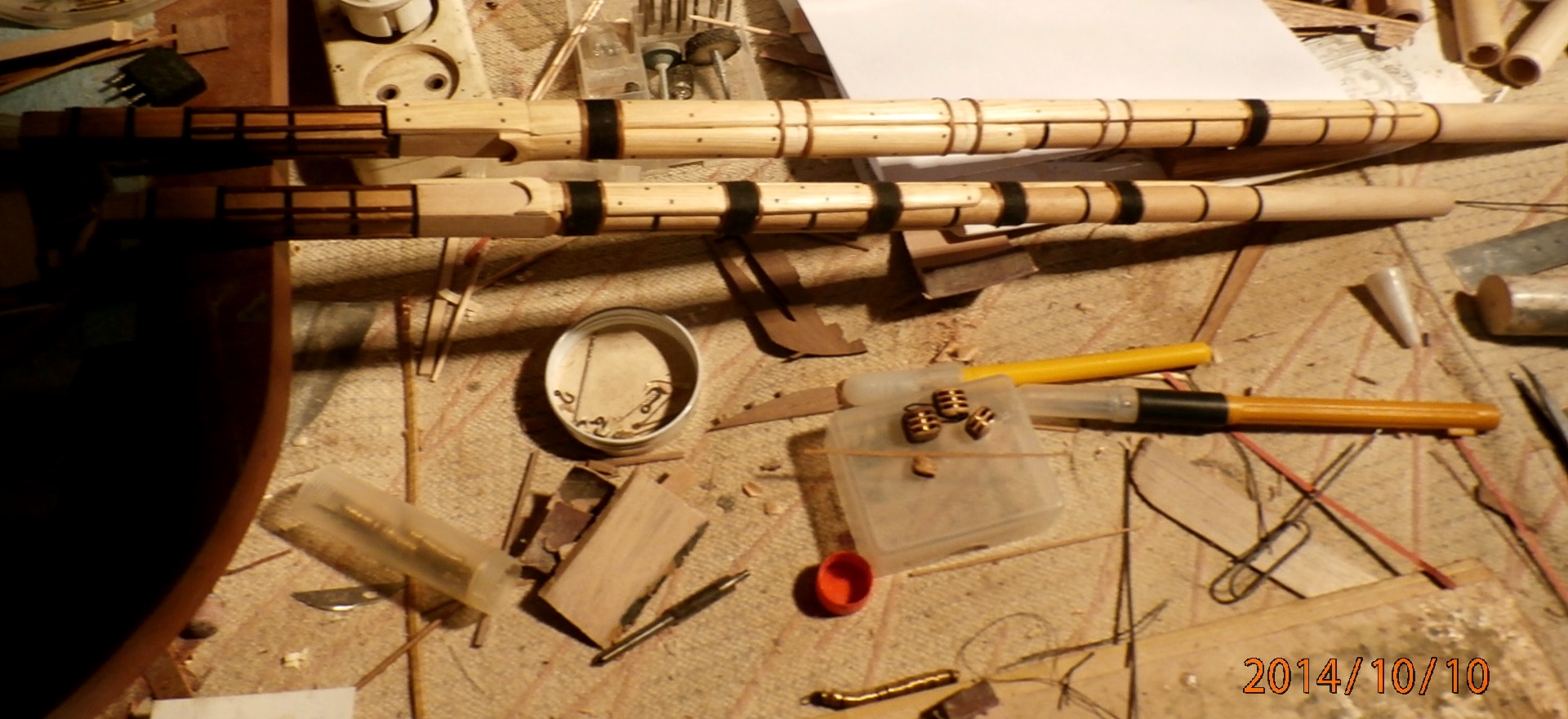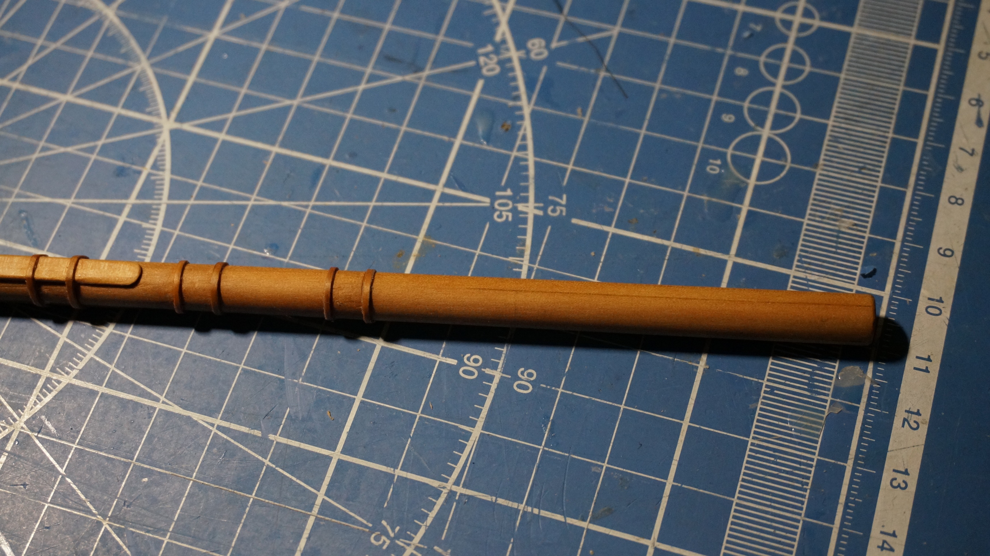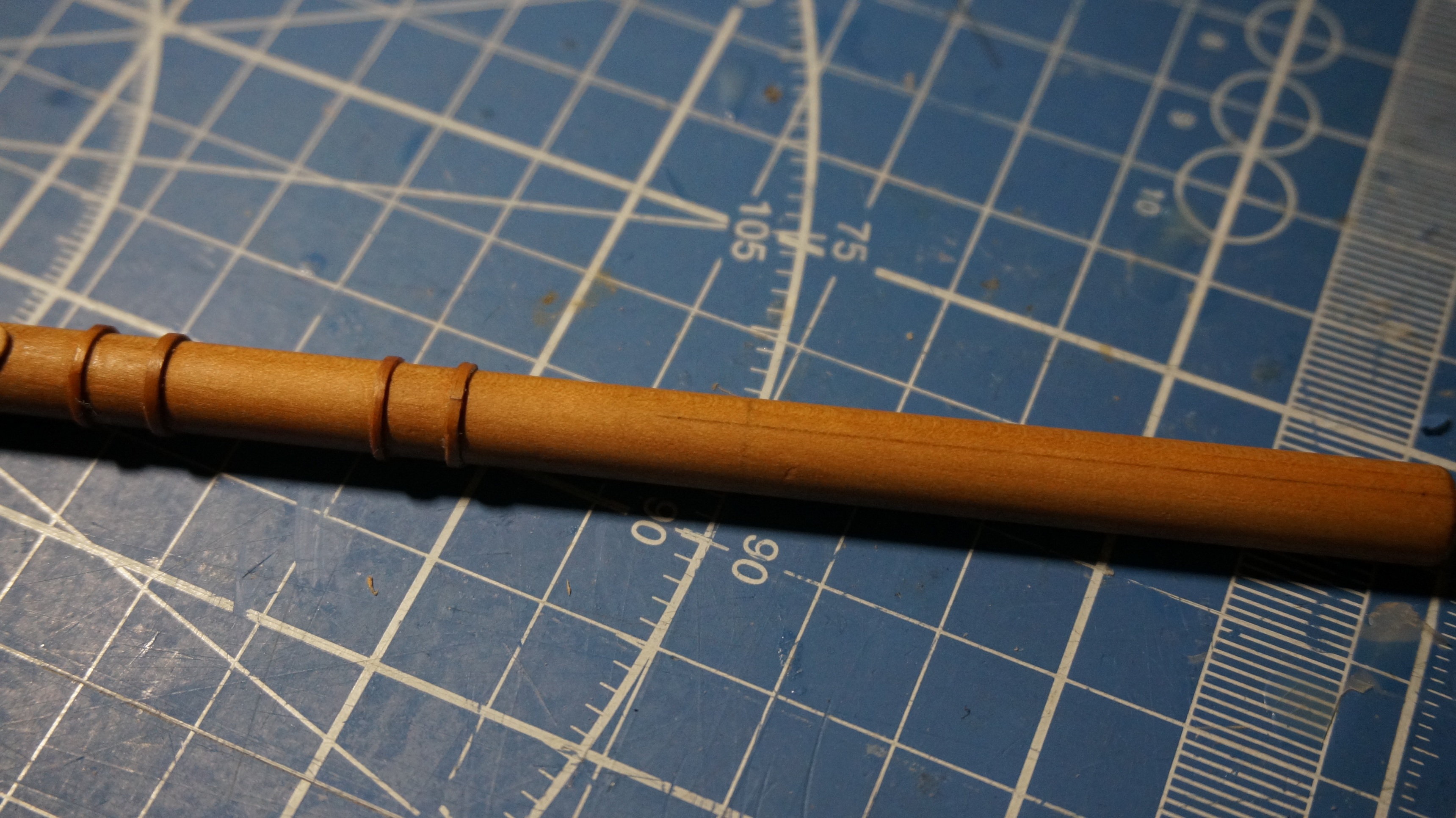Звать его рейсмус которым я делал разметку. После покрытия маслом эта разметка отлично проявилась. Одно спасибо на 90% царапины уйдут под палубу, остальное плохо видно. А вот стеньги ...., даже страшно за масло браться. А ведь придется