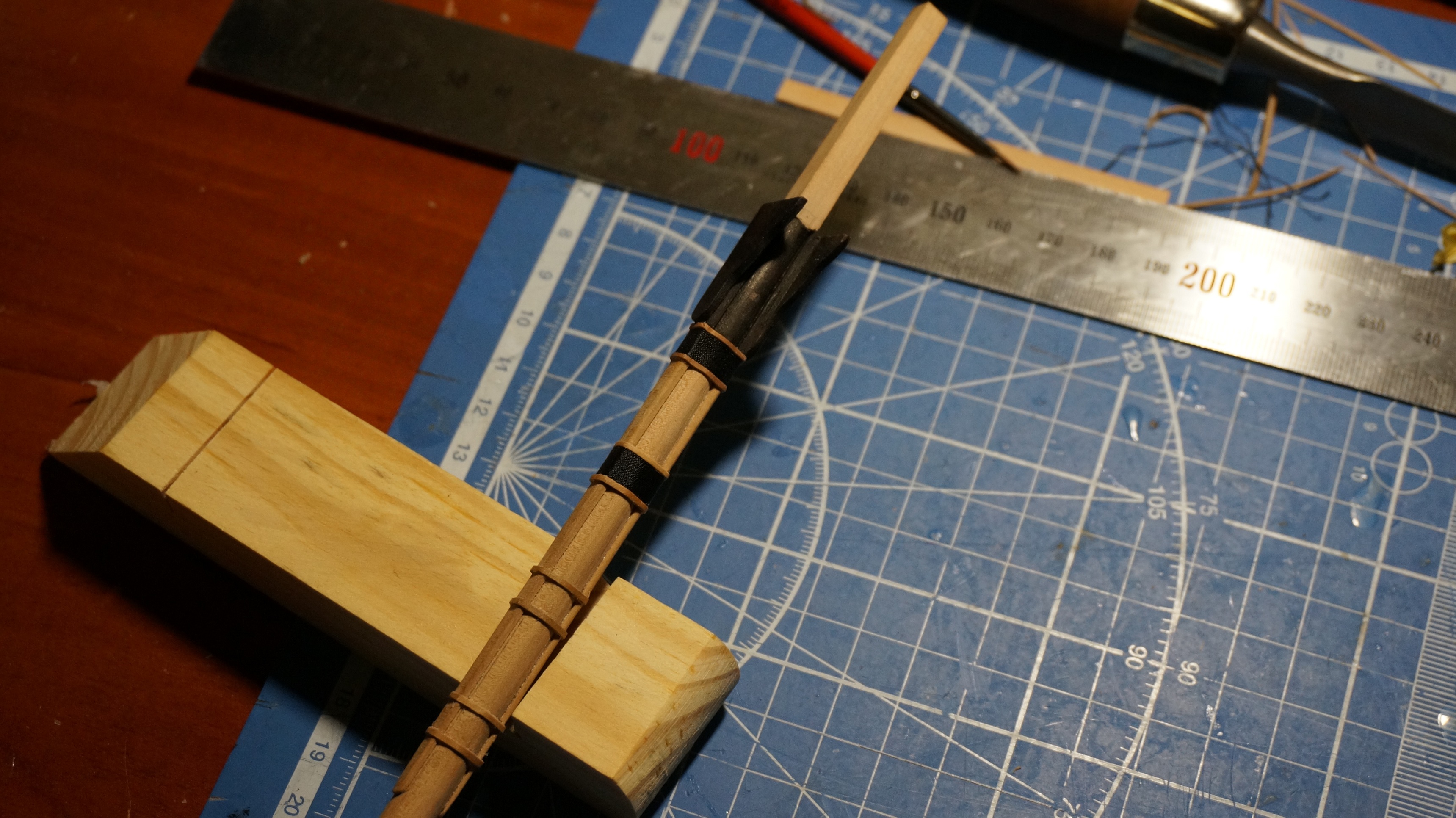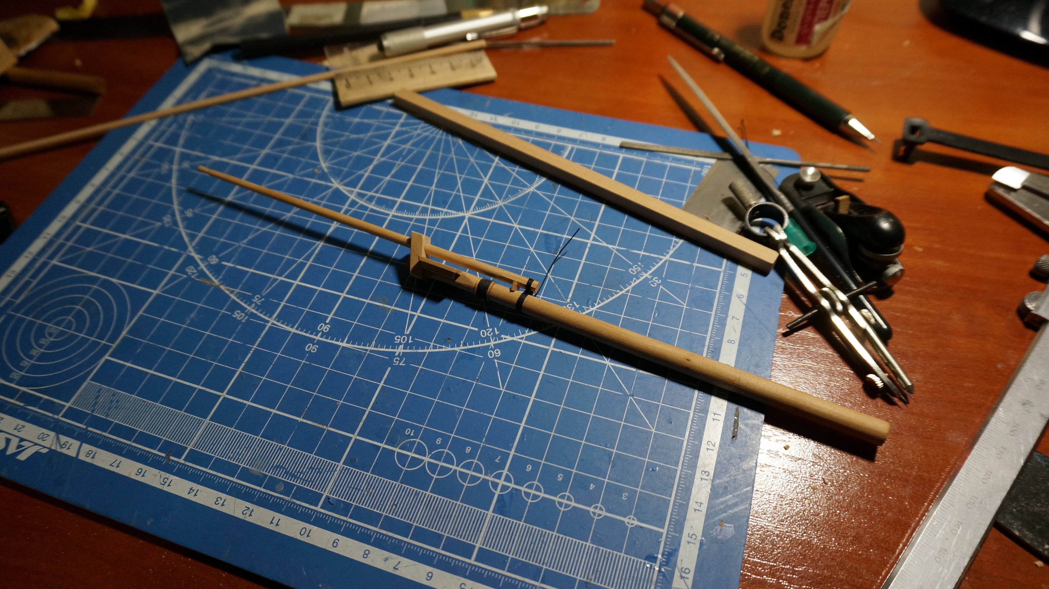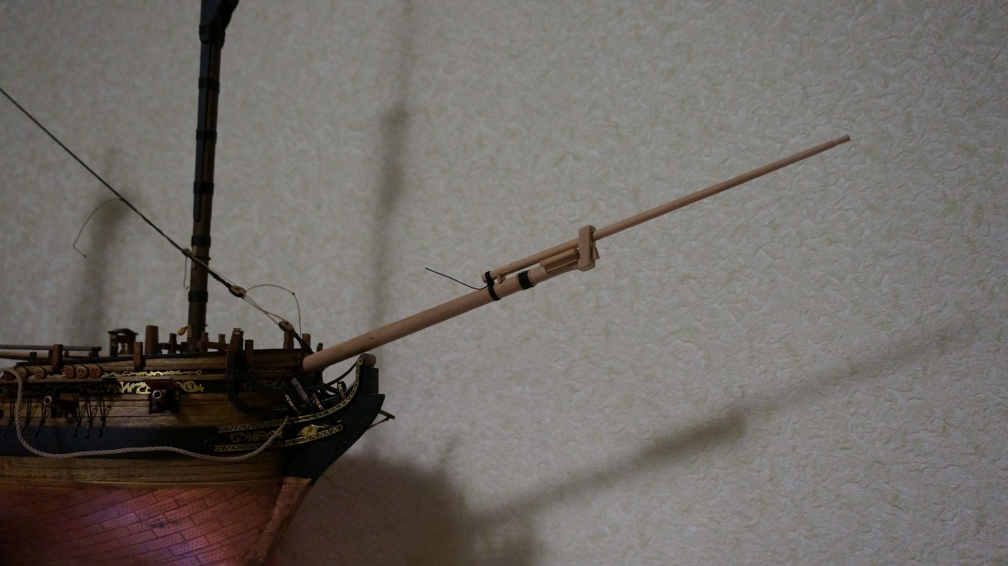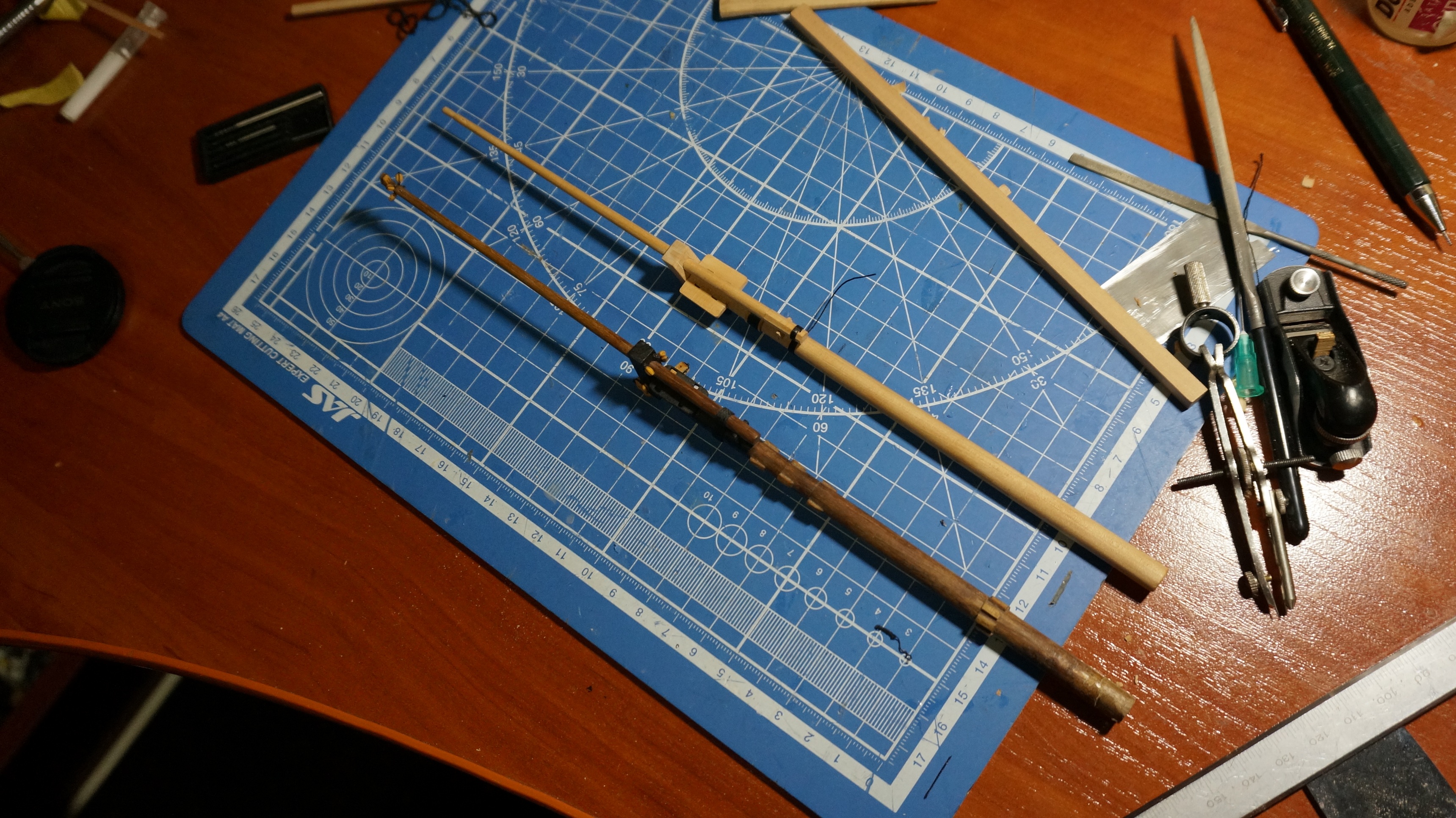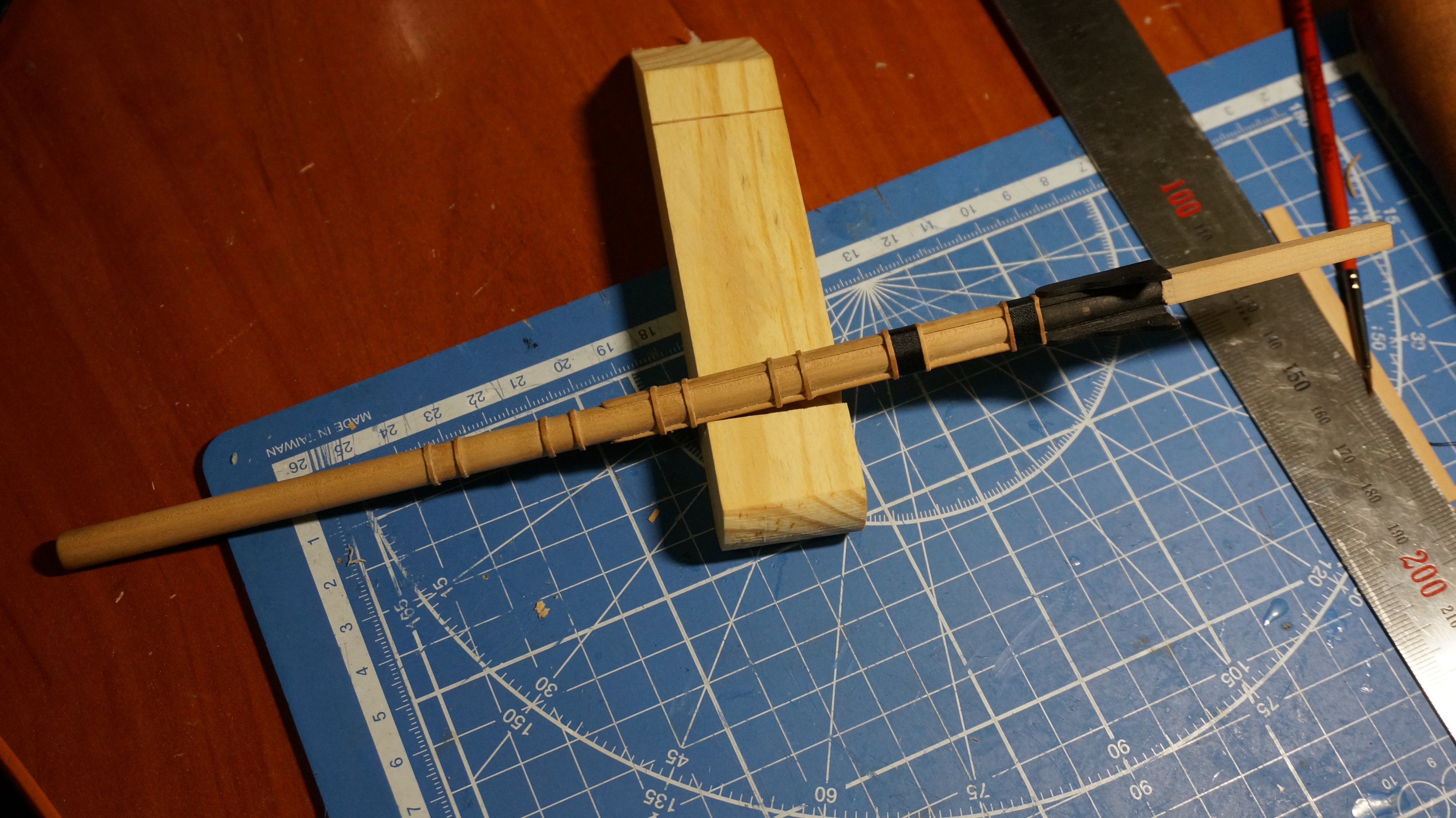 Новый бушприт готов на 80%, сделан ближе к расчетным значениям целиком из груши. Осталось добавить стоп-клампы но на них сейчас нет материала (нужна рейка 1Х1 мм.) по мере работы над остальными мачтами должно получиться некоторое количество обрезков их использую (или докуплю/распущу остаток)