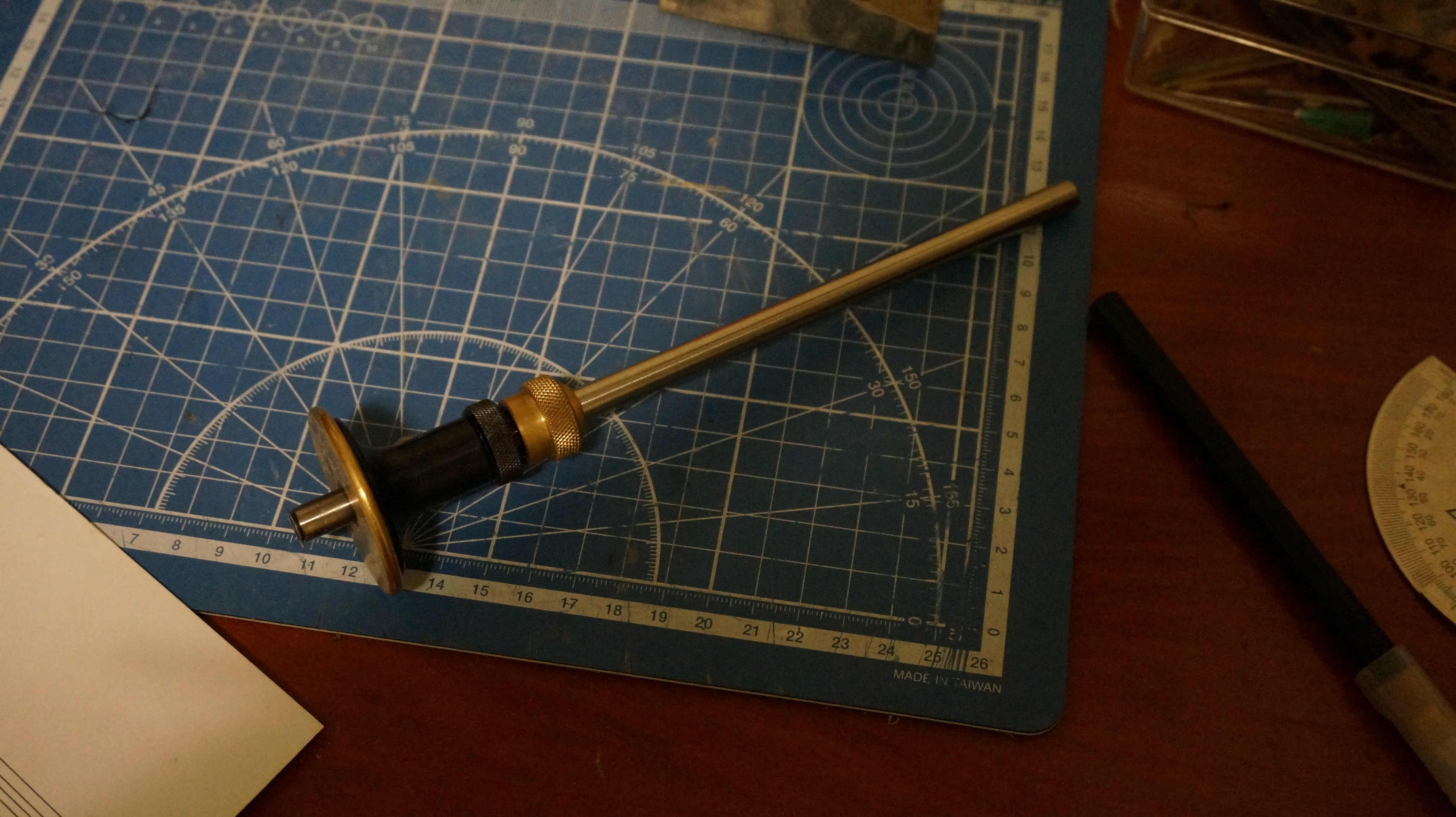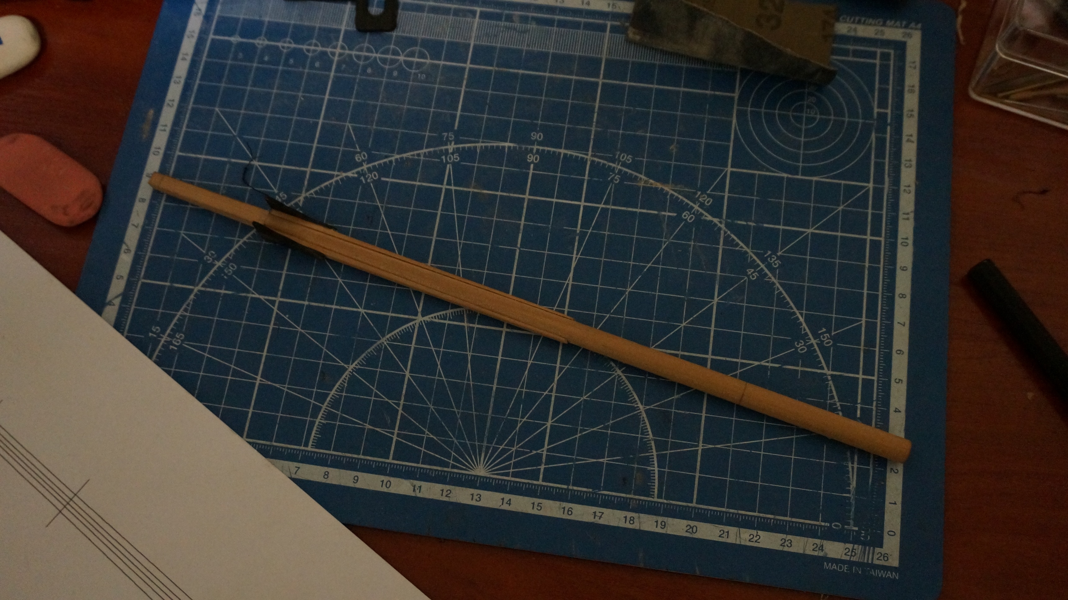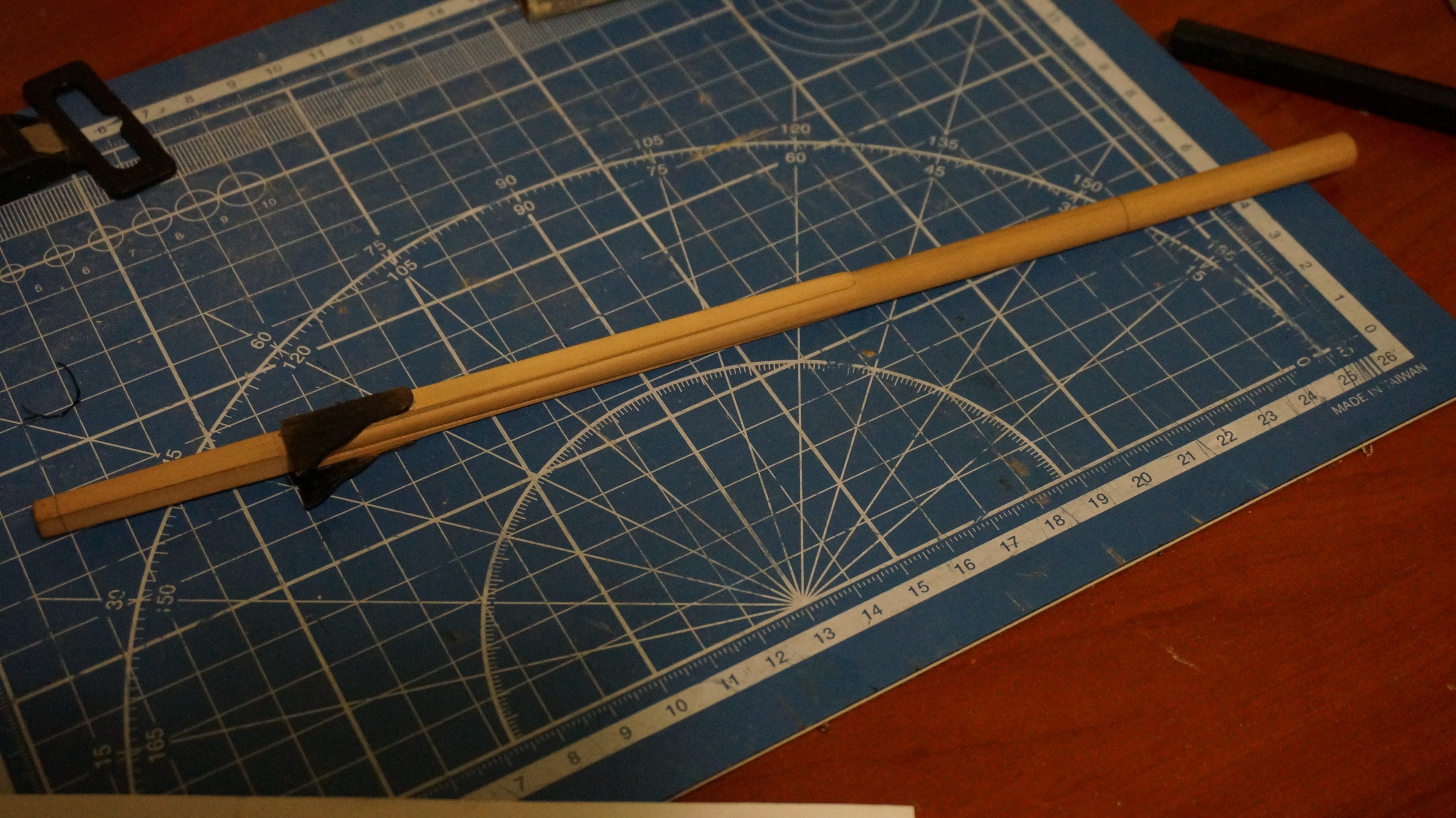 Сегодня занялся фок-мачтой. В ходе разметки заужения заметил одну особенность. Изначально начертил чертеж в "Компасе" (КАД приложение простое и удобное) Распечатал и снимая размеры с чертежа стал размечать. Заметил одну особенность практически не смысла рассчитывать диаметры мачт по четвертям (по крайней мере до диаметра 8мм. точно) дело в том максимальная разбежка между кривой начерченной по 4-м токам и прямой (по максимальному и минимальному диаметру) оставила 0.17мм. при толщине линии при распечатке примерно 0,2мм. ловить такую блоху не просто бесполезно но и вредно
