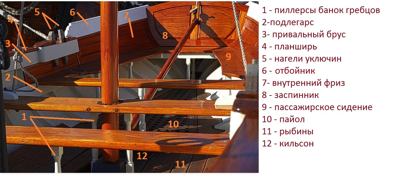 Кормовая банка гребцов соединялась с пассажирскими сидениями, и на неё крепились два прямоугольных в сечении упора транца, иначе называемые суппорты: