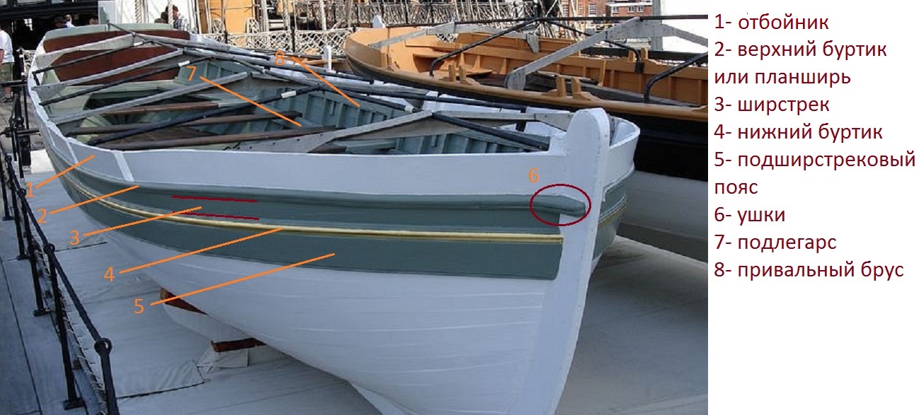 На всякий случай, я повторю: ширстрек, буртики, подширстрековый пояс – эти поясья относятся к внешней обшивке шлюпки и видны с наружной части борта; подлегарс и привальный брус находятся внутри корпуса шлюпки и видны с внутренней части борта.