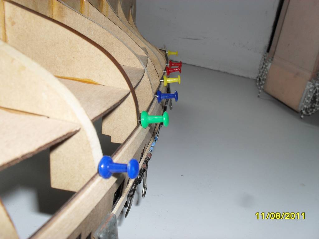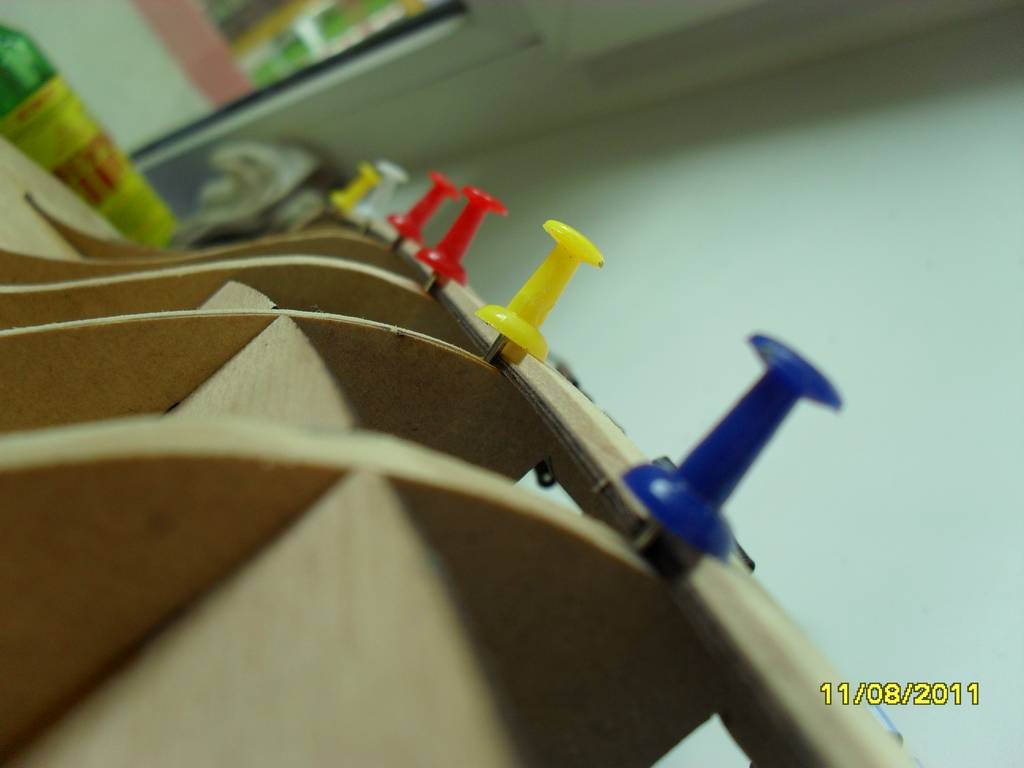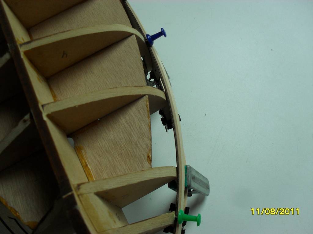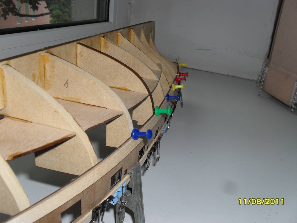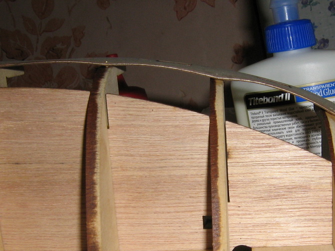 Так получил цилиндричность фальшборта (почему к трубе, а не к черенку лопаты? - я эту трубу еще в дугу гнул для придания нужной формы поверхности! Оказалось - в дугу излишне!). Потом наложил на шпангоуты и закрепил верх прищепками за топтимберс, низ - кнопками в шпангоут, но не непосредственно, а проложив рейки от чистовой обшивки, которые дали равномерный прижим по всей длине и выровняли края ФБ. Сейчас это хозяйство сохнет, вечером посмотрю, что получилось. На первый взгляд - более-менее нормально!