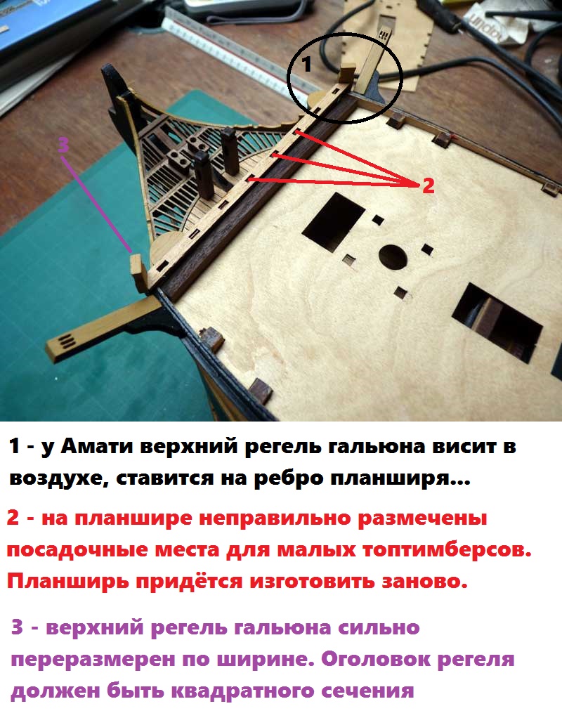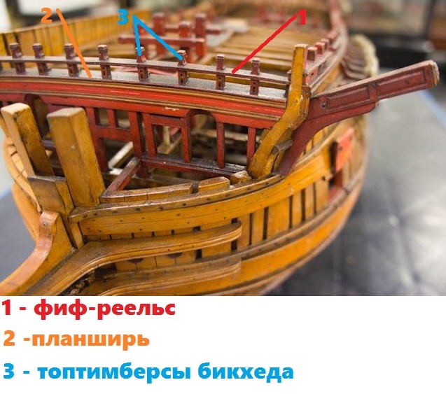Что нам важно для переделки? Амати здесь накосячила с носовыми топтимберсами и носовым фиф-реельсом, расположенными наверху переборки.