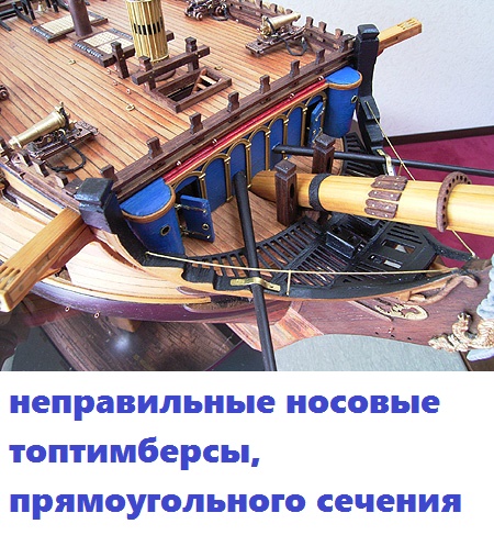 Соответственно, надо выкинуть и планки обоих носовых планширей, нижнего и верхнего. Так же важно знать количество носовых топтимберсов и их расположение. Судя по сохранившимся адмиралтейским моделям, "большинством голосов", малых топтимберсов квадратного сечения было девять, и плюс по одному топтимберсу большего размера по краям борта. Эти крайние "большие" топтимберсы являлись не оголовками тимберсов носовой переборки, а оголовками поворотных шпангоутов корпуса, и к ним крепились оголовки основных (верхних) регелей гальюна. Крайние топтимберсы были больше по всем размерам, чем "центральные", те, что "малые", квадратного сечения.