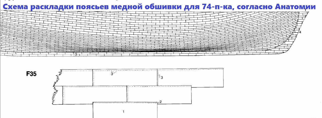 Не используйте континентальные и американские схемы, которые вы наверняка встречали у Будрио, Монфельда, Кемпбелла и др. Обычно, континентальную схему можно опознать по нескольким поясьям медной обшивки, идущих параллельно ватерлинии от этой самой ватерлинии вниз. А американский способ, так хорошо описанный Кемпбеллом как «универсальный для всех», помимо этих поясьев, ещё и подразумевал укладку меди "с краёв к миделю". Эти способы обоснованы удобством работ при килевании корабля, но англичане шли более сложным путём. Применить на английском корабле европейскую укладку меди - это однозначно угробить модель. С таким же успехом вы могли поставить на мачтах вашего Авангарда французские эзельгофты-кепки, например.