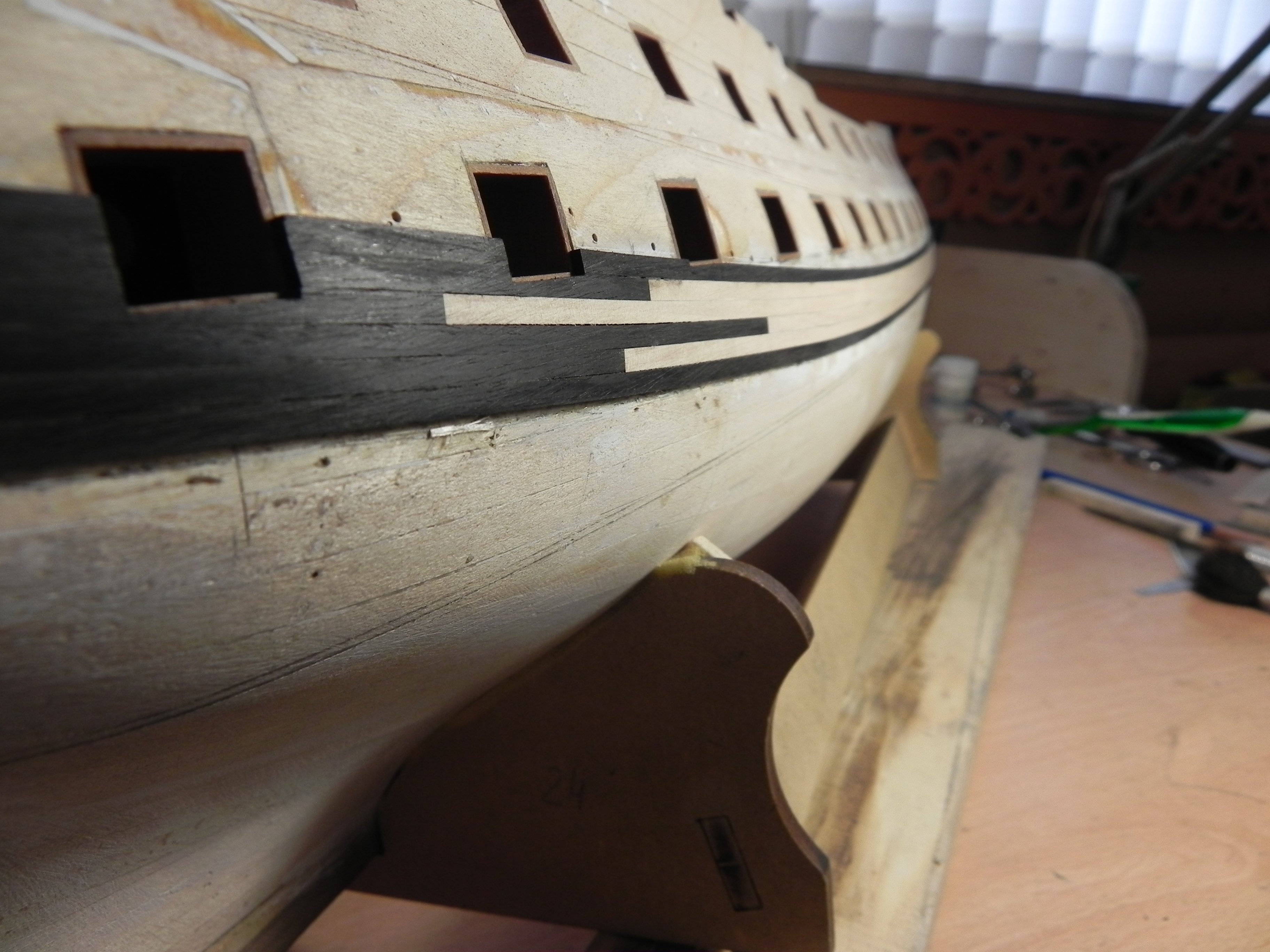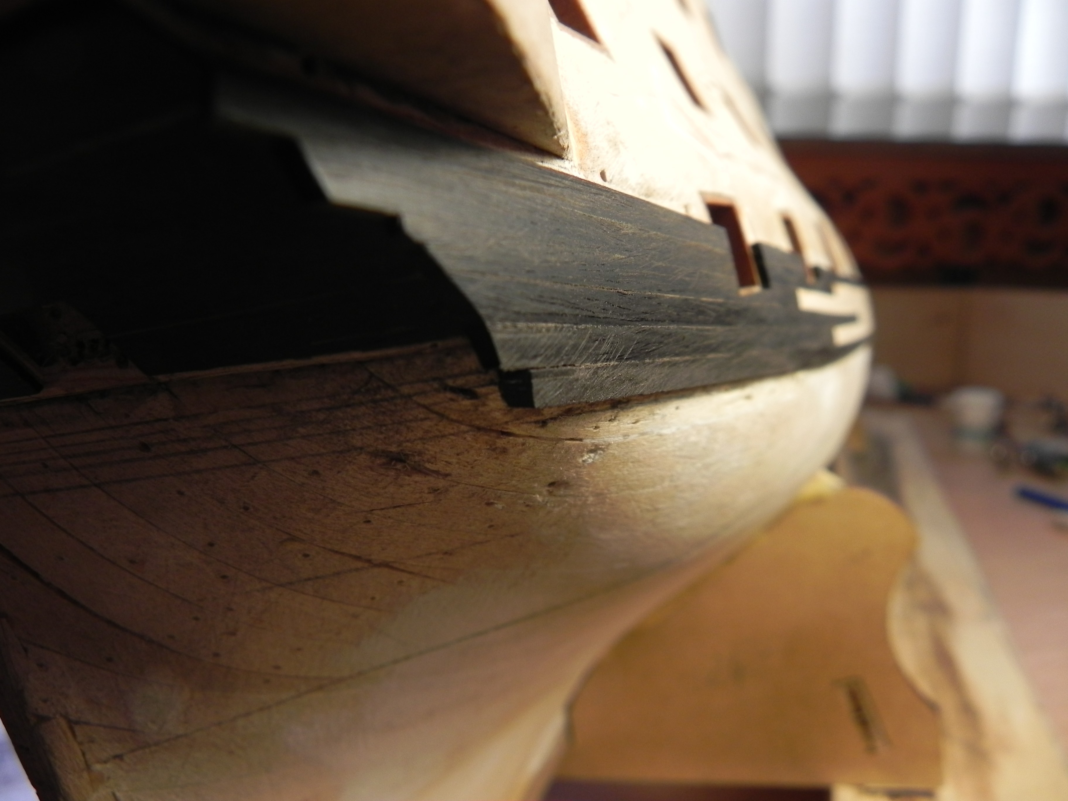 Регели. Их на модели три пары. Верхний регель, он же мейн-реельс, самая сложная деталь. Мало того, что он сильно изогнут, так он ещё должен проходить строго по отношению к решетке гальюна так, чтобы его верхняя грань была заподлицо с решеткой, а из-под нижней грани не должны выступать посадочные места гед-тимберсов (возможно, гед-тимберсы придётся подточить снизу).