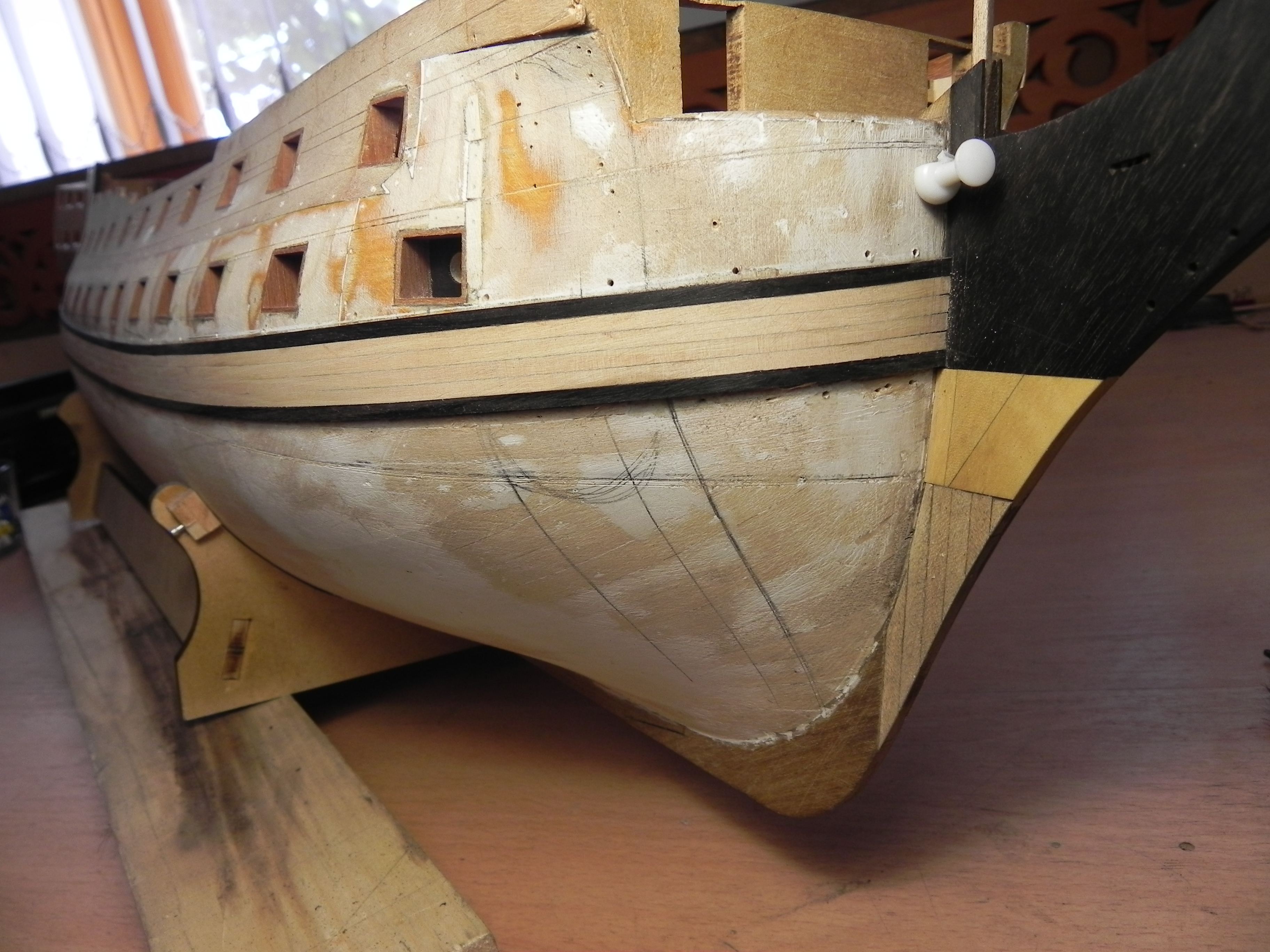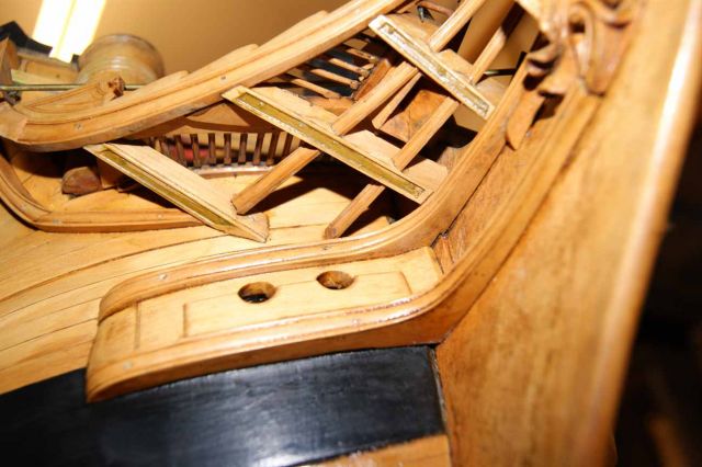 Фальшреельс состоит из волнообразных треугольничков. Первый от борта, большой треугольник с орнаментом - это защитный щиток штульца (туалета), расположенного возле полукруглой будки вперёдсмотрящего. На модели этих штульцев нет. Треугольники поменьше - это роульсы для работ с якорями. Вернее, раньше здесь были шкивы, роульсы, но их упростили до обычных деревянных выступов. Будете делать фальшреельс, не переусердствуйте с закруглением этих выступов, а то морякам неудобно будет с якорями работать. Так же у фальшреельса обычно было гнездо для галс-боканца. На этом фальшреельс заканчивался, а у Амати, похоже, он идёт по всему регелю до самой завитушки (волюты).