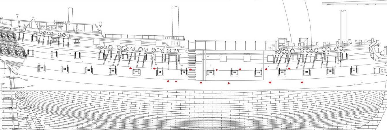 Ещё одна доработка модели Амати. Не переделка, а просто добавление деталей. Шпигаты. Снаружи борта они будут выглядеть как развальцованные свинцовые трубки. На основании записей Лэвери и Фонио я расставил шпигаты для нашей модели. Все шпигаты одного диаметра. Все шпигаты одной палубы утоплены ниже на одинаковое расстояние. На рисунке у меня не получилось так. Просто мне не удалось в паинте отметить точки достаточно красиво и ровно по высоте