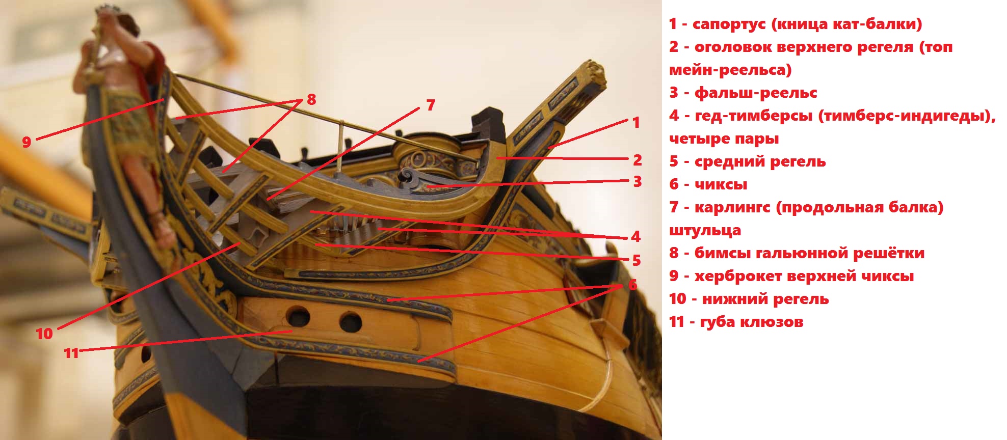 Чтобы избавить моделистов от мучений, аматиевцы выполнили узел "решетка гальюна - гед-тимберсы" так, как никогда не было на прототипе, но очень удачно для модели. Гед-тимберсы - это шпангоуты гальюна. Гед-тимберсы "растут" из княвдигеда, упираются в верхний регель (мэйнреельс) и к ним крепятся бимсы гальюнной решётки. Гед-тимберсы так же имеют пазы для среднего и нижнего регелей. У Амати каждая пара гед-тимберсов сделана единым моноблоком, вставляемом в специальный паз на княвдигеде.