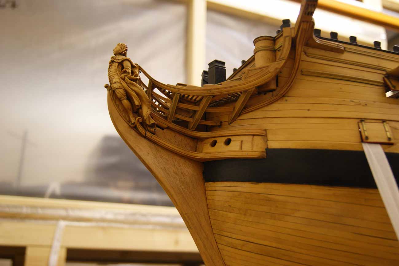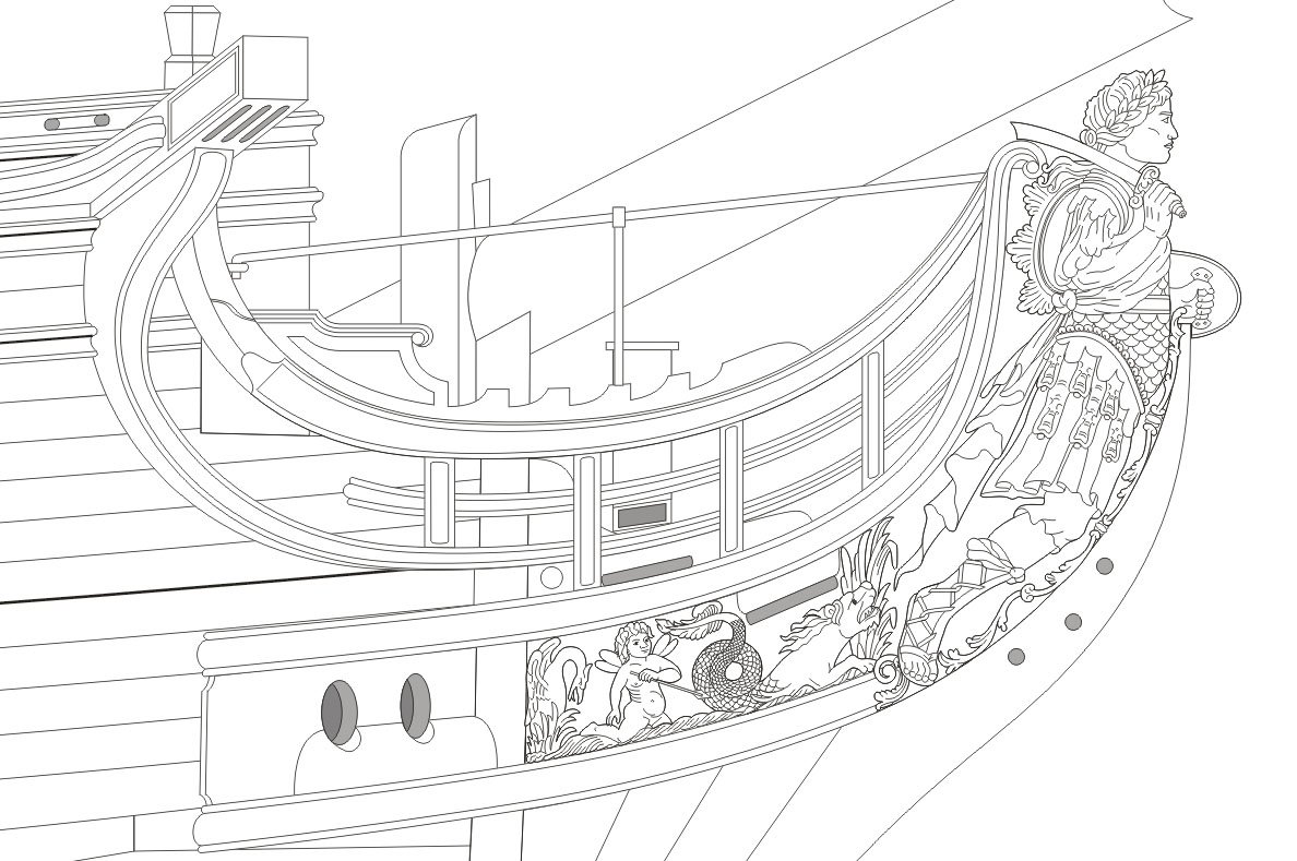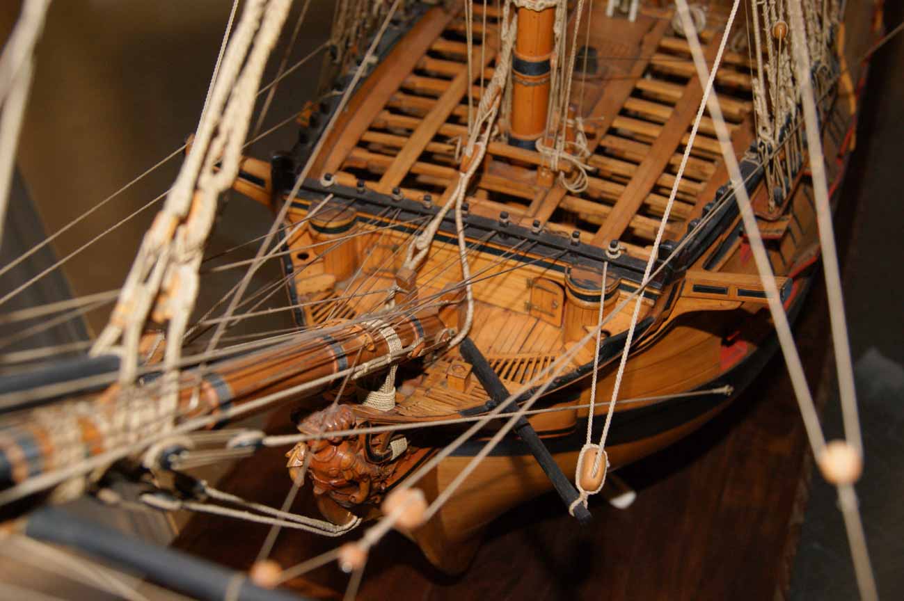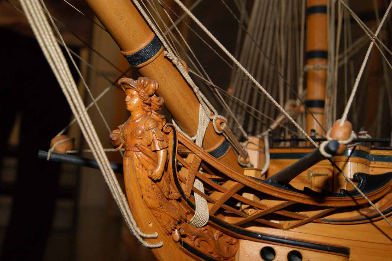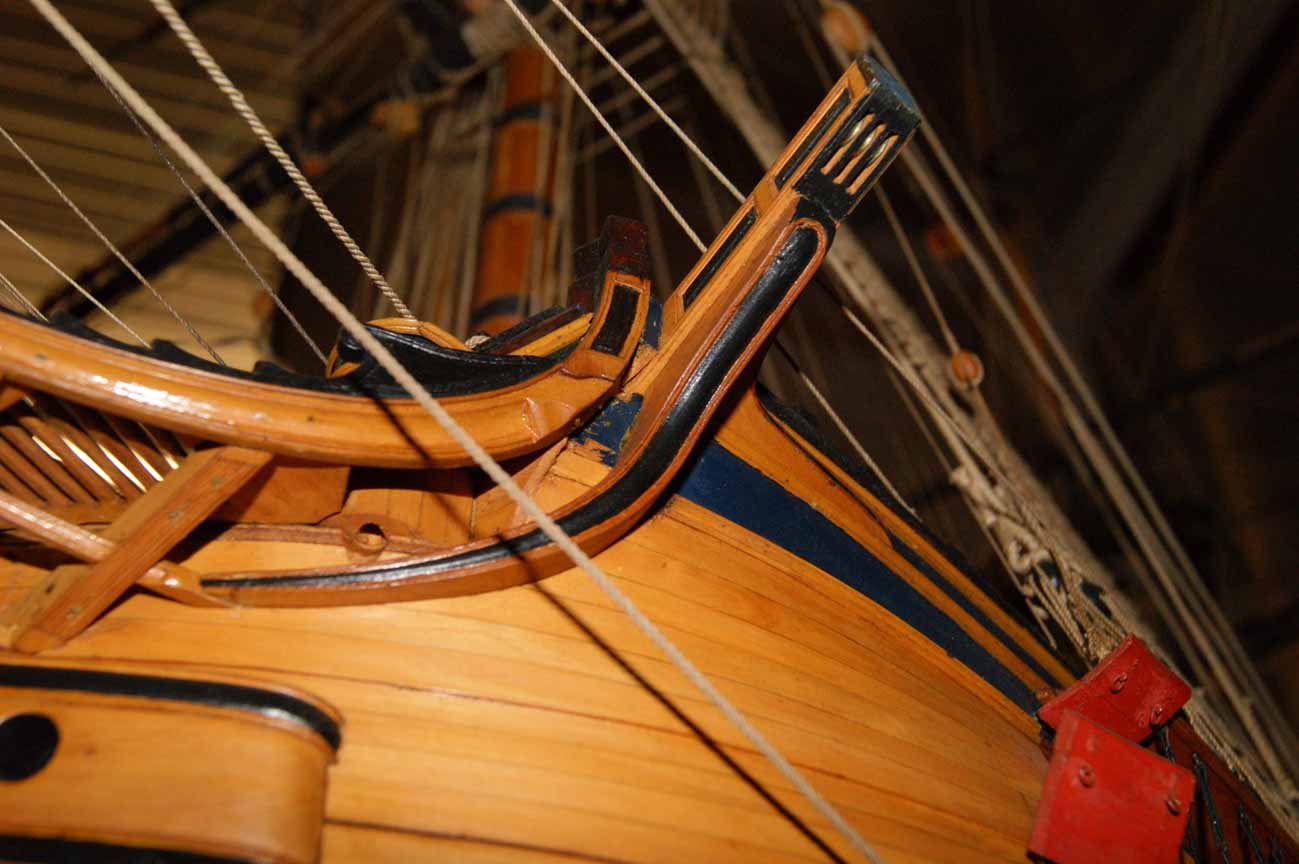 Четвёртое: под бушпритом никаких решеток не было, и не только в месте прохождения ватервулинга. Зато хорошо видны продольные балки решётки гальюна - карленгсы. На модели карленгсов нет.