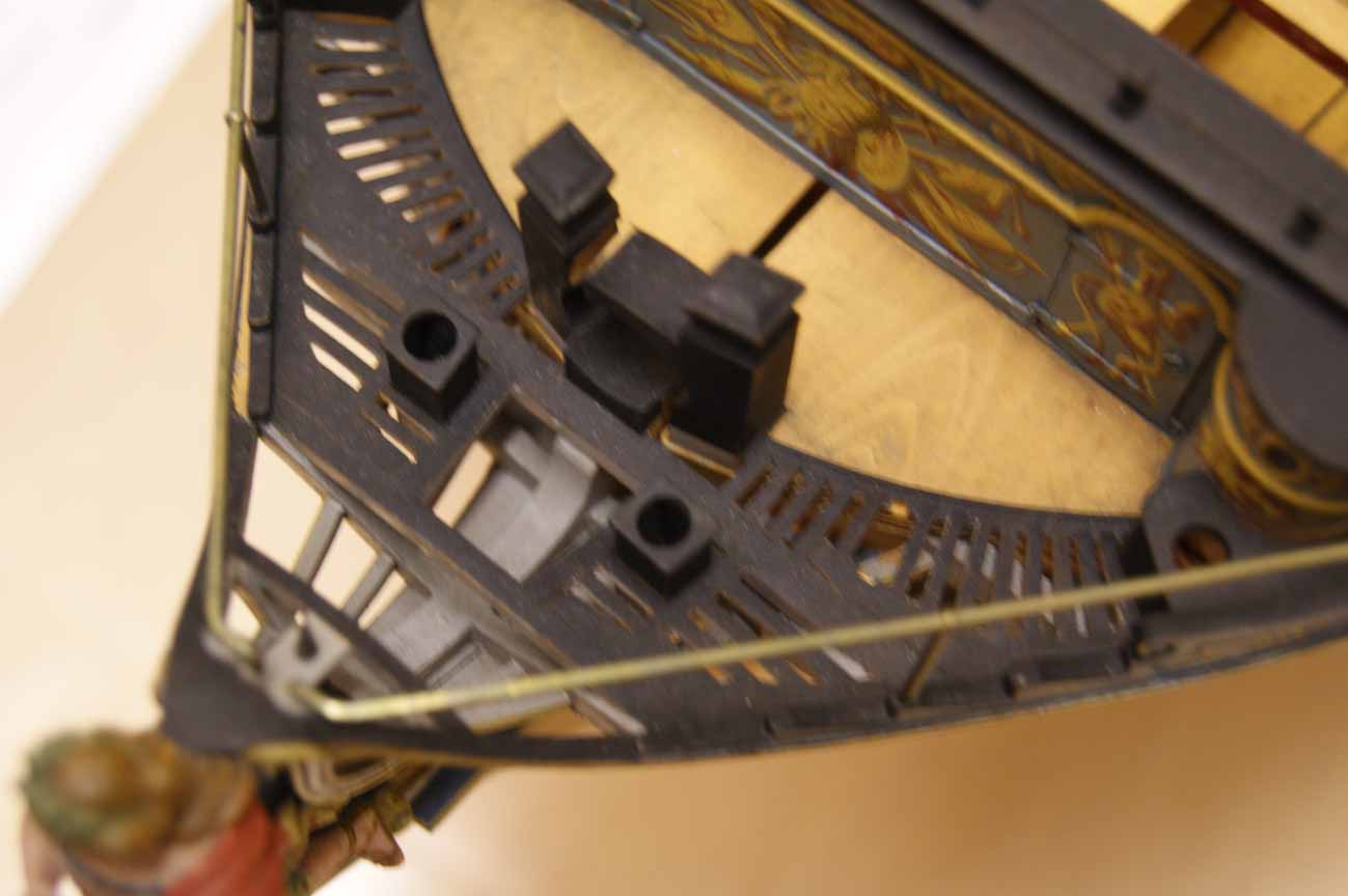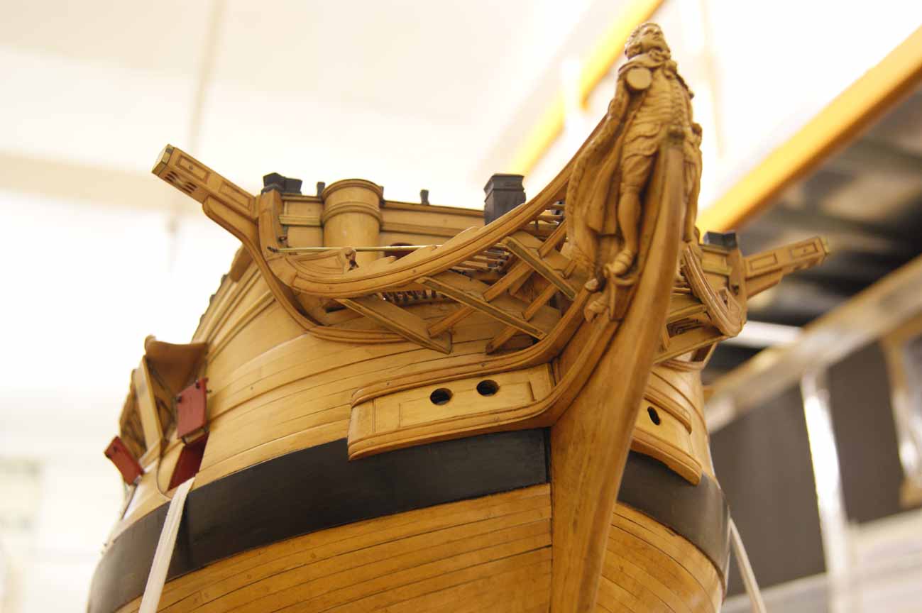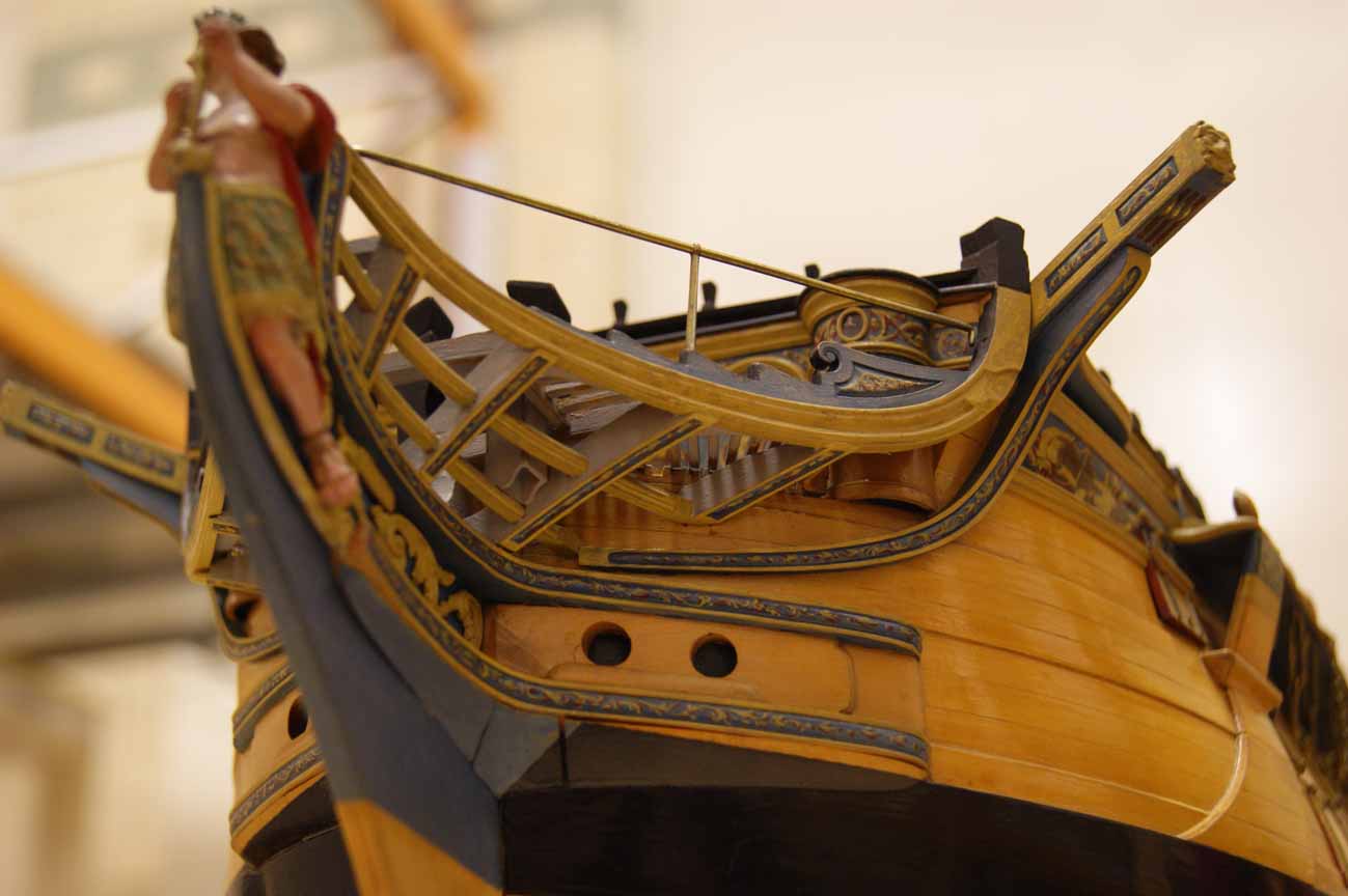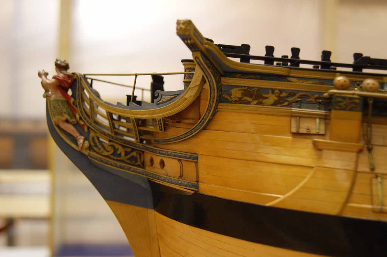 Четвёртое: под бушпритом никаких решеток не было, и не только в месте прохождения ватервулинга. Зато хорошо видны продольные балки решётки гальюна - карленгсы. На модели карленгсов нет.