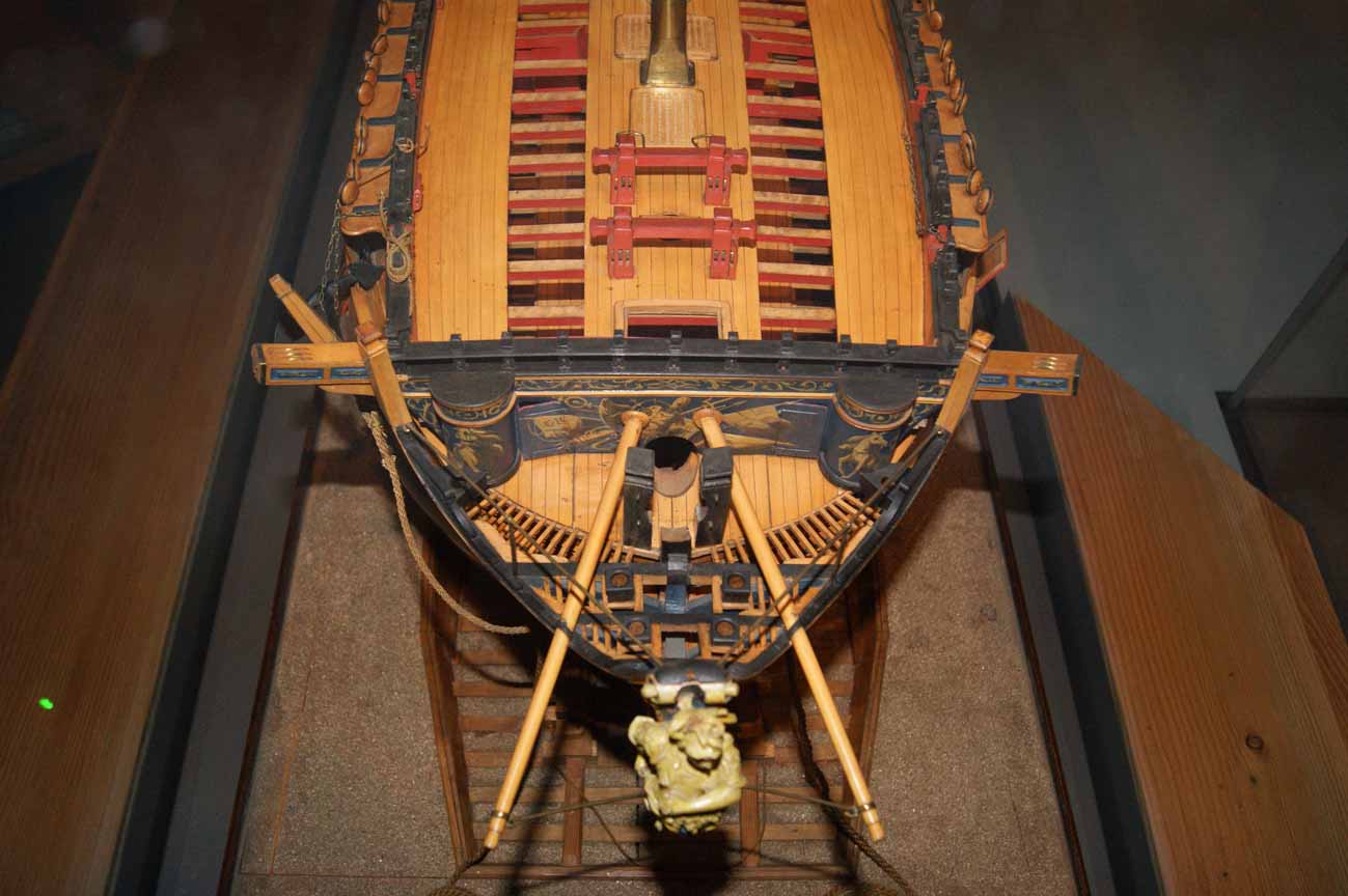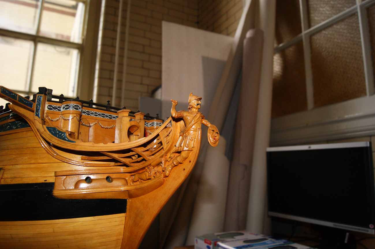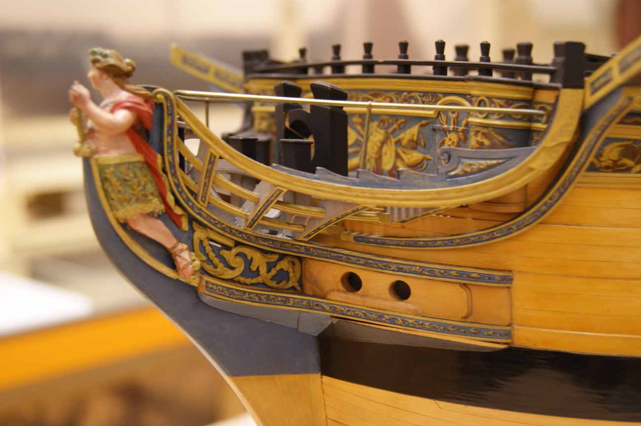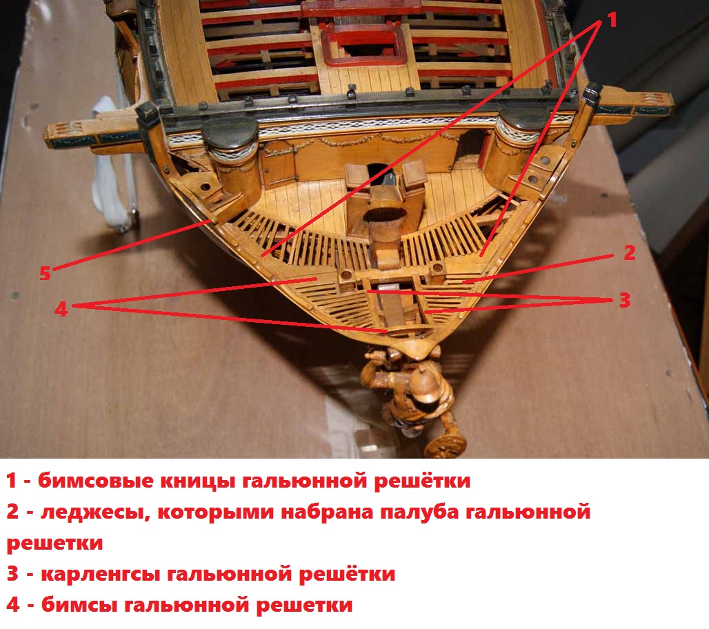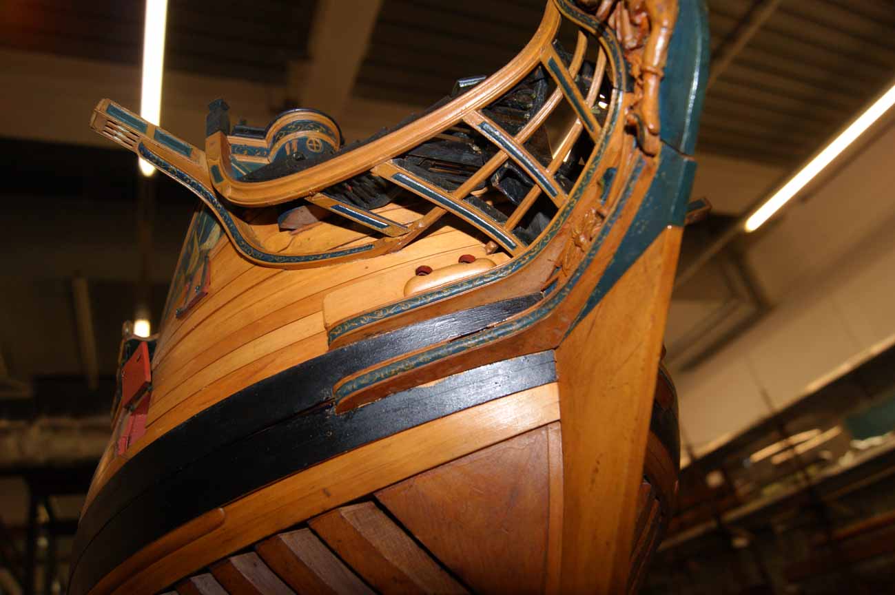 Четвёртое: под бушпритом никаких решеток не было, и не только в месте прохождения ватервулинга. Зато хорошо видны продольные балки решётки гальюна - карленгсы. На модели карленгсов нет.