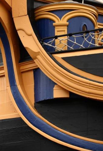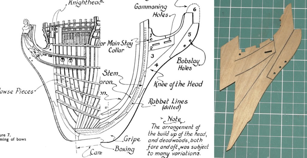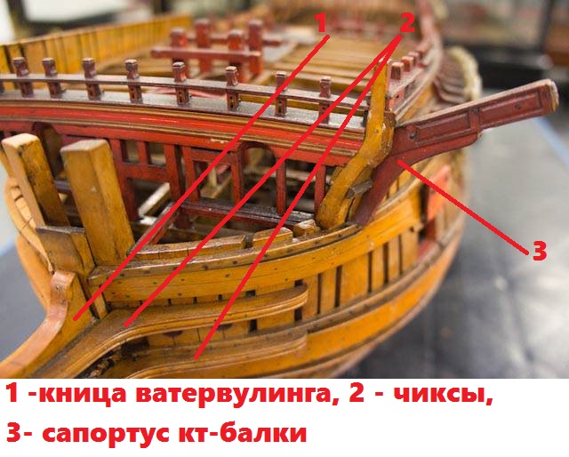 Более того, верхний регель ещё и сужается в сторону носовой фигуры, как по высоте, так и по толщине. Оголовок этого регеля должен иметь квадратное сечение. А вот ниже регель имеет сложный фигурный профиль, имитирующий плавный переход вниз всего гальюна, этакий художественный способ передать единство линий всей конструкции. Поэтому в верхней части сечения регеля он имеет полную толщину, но ниже в сечении фигурная резьба убрала половину толщины регеля. Разглядывая чертежи, почти невозможно угадать профиль верхнего регеля. Хорошо, сохранившиеся адмиралтейские модели помогают. На некоторых моделях фаска на нижней кромке регеля снята в один заход, на других - в два, как на Виктори.
