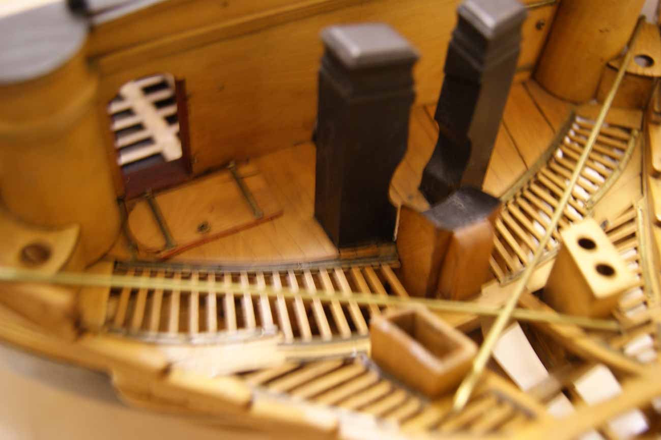 Второе, это то, что вместо стыков секций решетки здесь были бимсы, опирающиеся на гед-тимберсы. Бимсы имели погибь, для увеличения прочности, и чем выше бимс и чем ближе к носовой фигуре, тем сильнее погибь бимса.