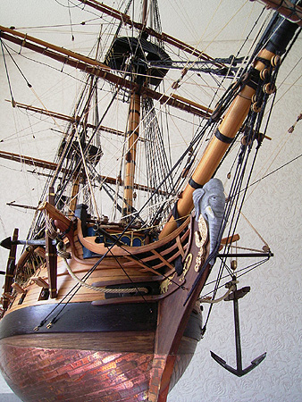 Теперь гальюн. Сложнейший элемент модели. Много мелких деталей, непрочная конструкция. Здесь Амати упростила сборку, очень продуманно разработала детали, и для любого начинающего моделиста изготовление гальюна будет несложным. Пожалуй, это самый удачный и наиболее достоверный гальюн на КИТ-моделях кораблей подобного класса. Спасибо, Амати. Однако, за простоту сборки мы расплатимся низкой степенью копийности. На какие ошибки и упрощения деталей гальюна стоит обратить внимание.