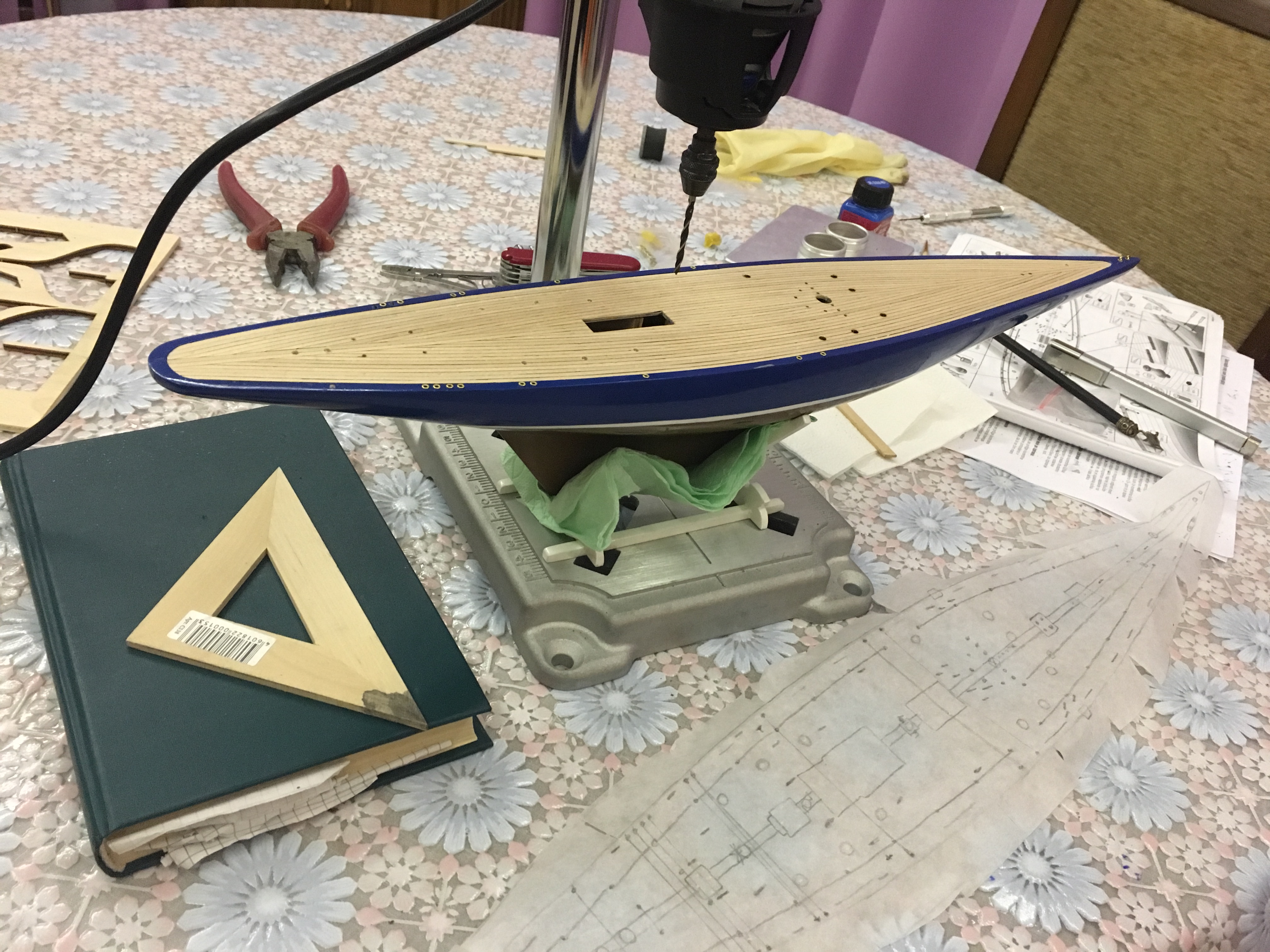 Станина с дремелем оказалась незаменимыми. Ровные и точные отверстия в палубе без их участия дались бы сложно. Особенно угол наклона сверла, идеально 90 град выдержать сложно на узких и скользких бортиках.