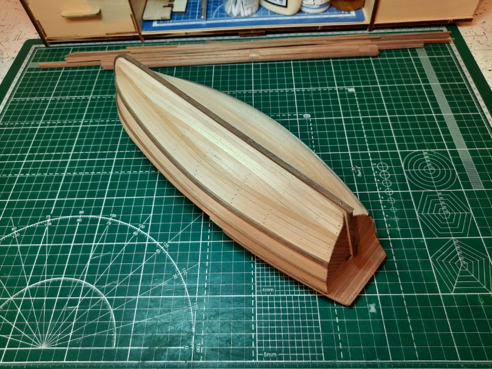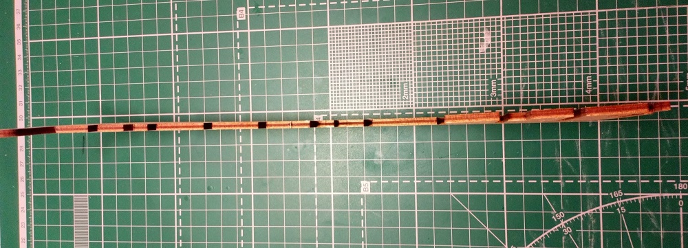 Начал чистовую обшивку корпуса между бархоутами рейками темного ореха 0,5 × 3 мм.