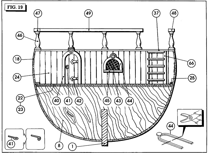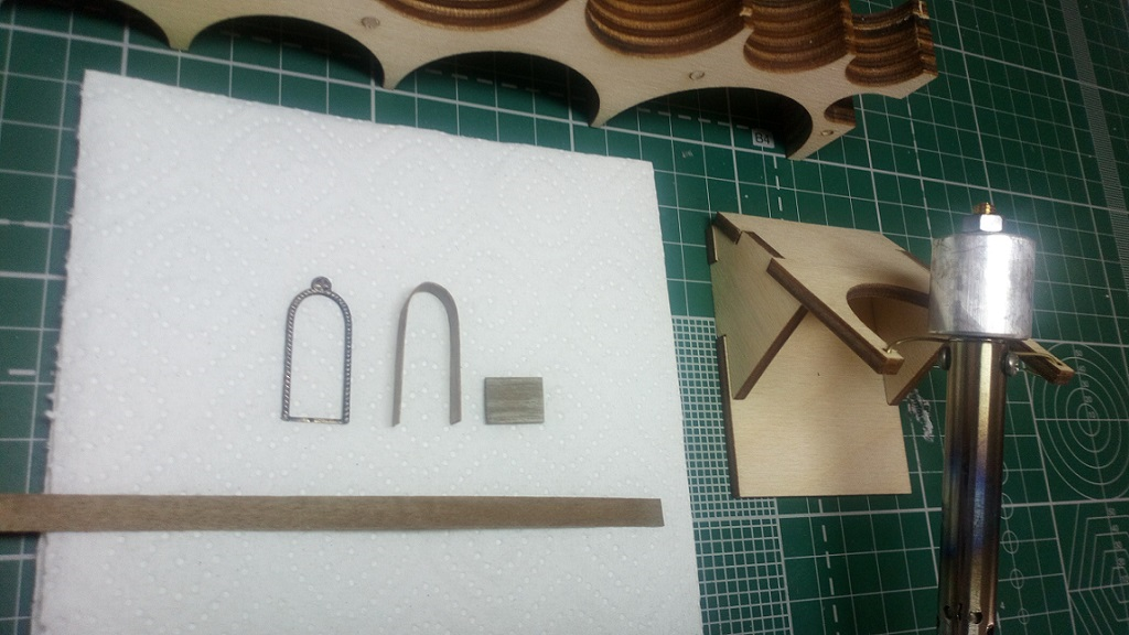 Перед тем, как установить на место шпангоут 8 сделал проемы окна и двери с подоконником и порогом. Проем согнул из ореховой рейки 0,5х6 мм (из своих запасов, в наборе нет) подоконник - ореховая рейка 2 мм толщины, порог - ореховая рейка 1 мм толщины. С помощью приспособы из паяльника, после вымачивания в воде 40 мин, удалось согнуть ореховую рейку 0,5х6 мм практически на 180 градусов, для высыхания крепил на шаблон, вырезанный из бальзы.