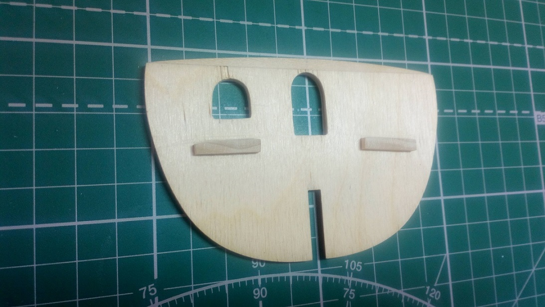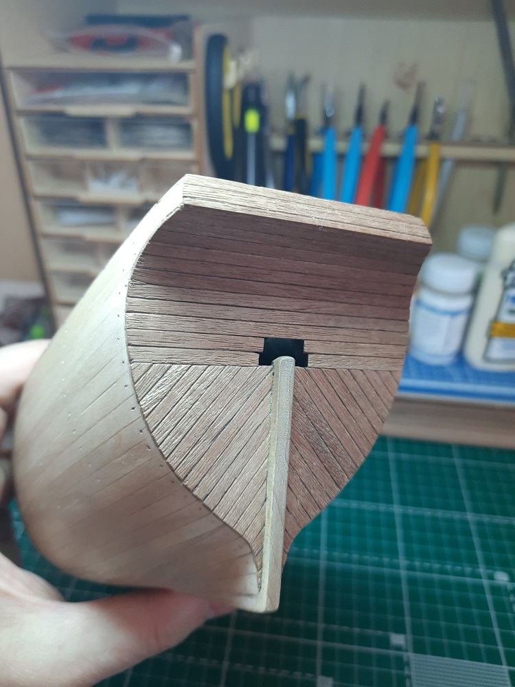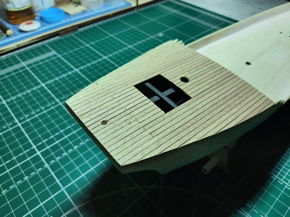 Так как конфигурация палубы надстройки была изменена из-за выполнения погиби, вырезал и вклеил на транец клинообразную вставку с толщиной по торцу в 2 мм.