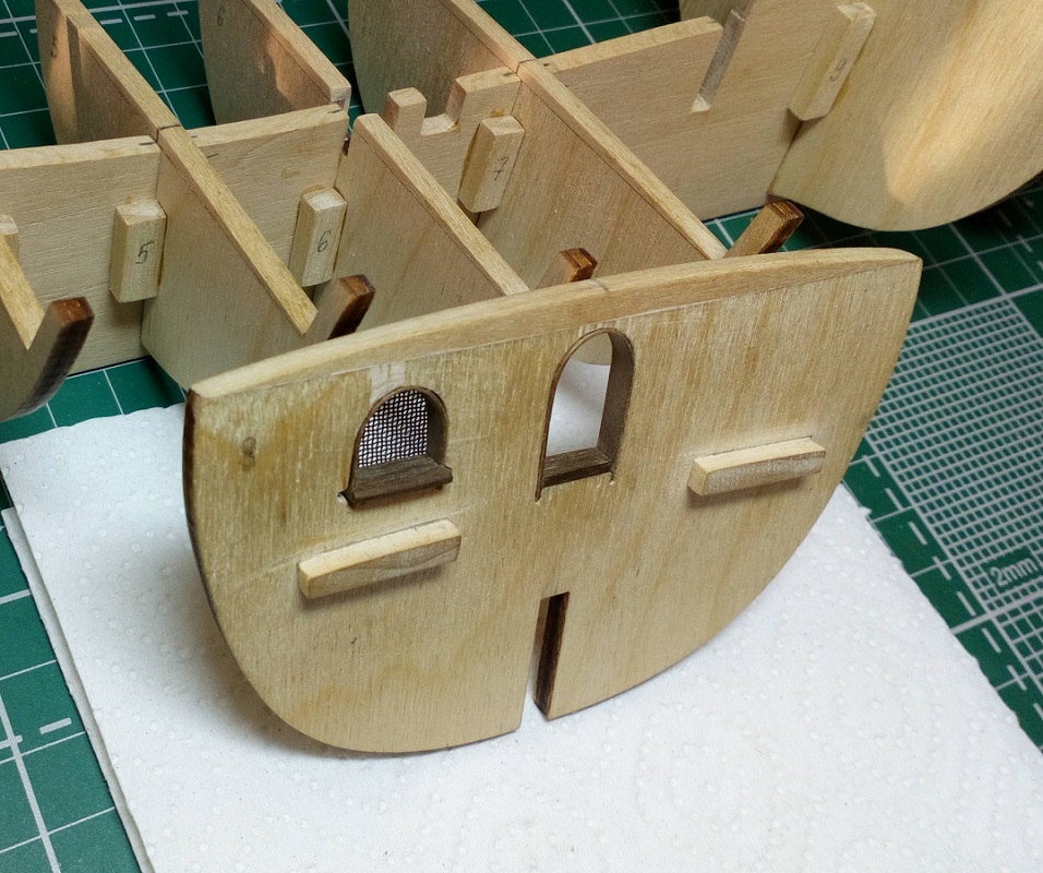 Сделал проем окошка и двери в шпангоуте 8. Решил оставить данную в наборе оконную сеточку и приклеил ее с обратной стороны шпангоута 8 на эпоксидный клей.