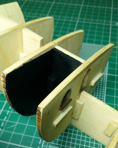 Закрасил черной акриловой краской часть шпангоута 9 и килевой рамки, находящихся за окошком.