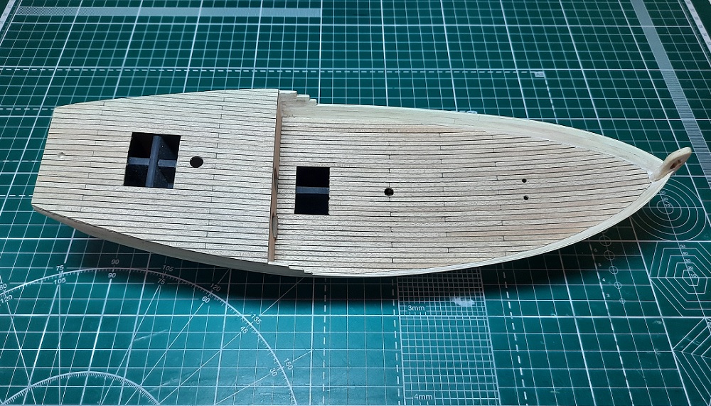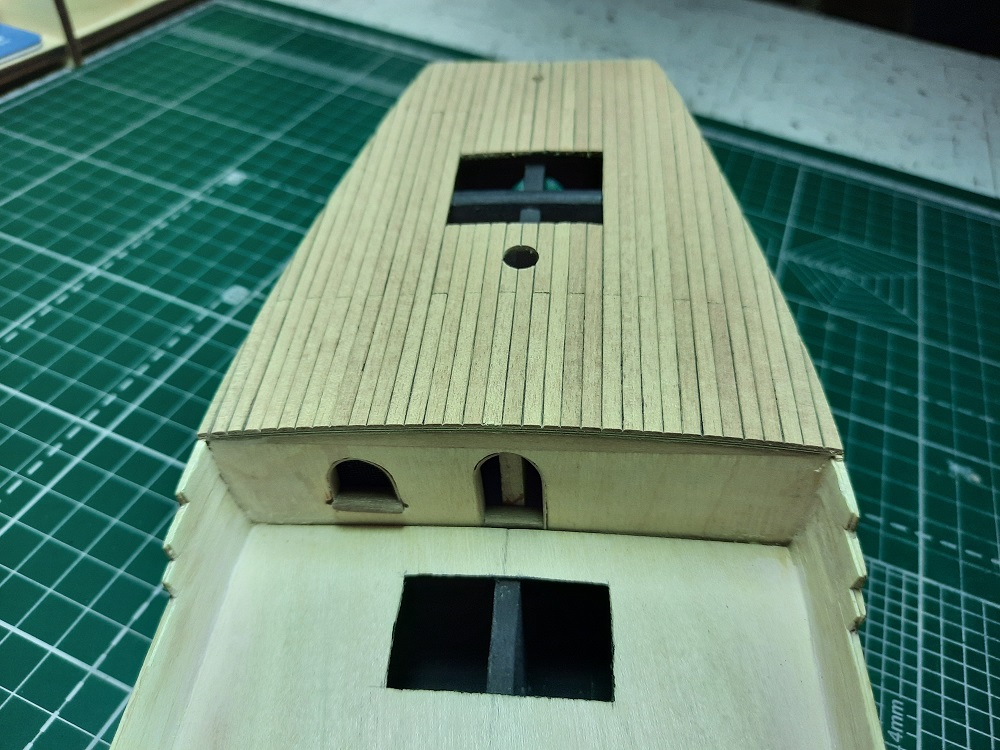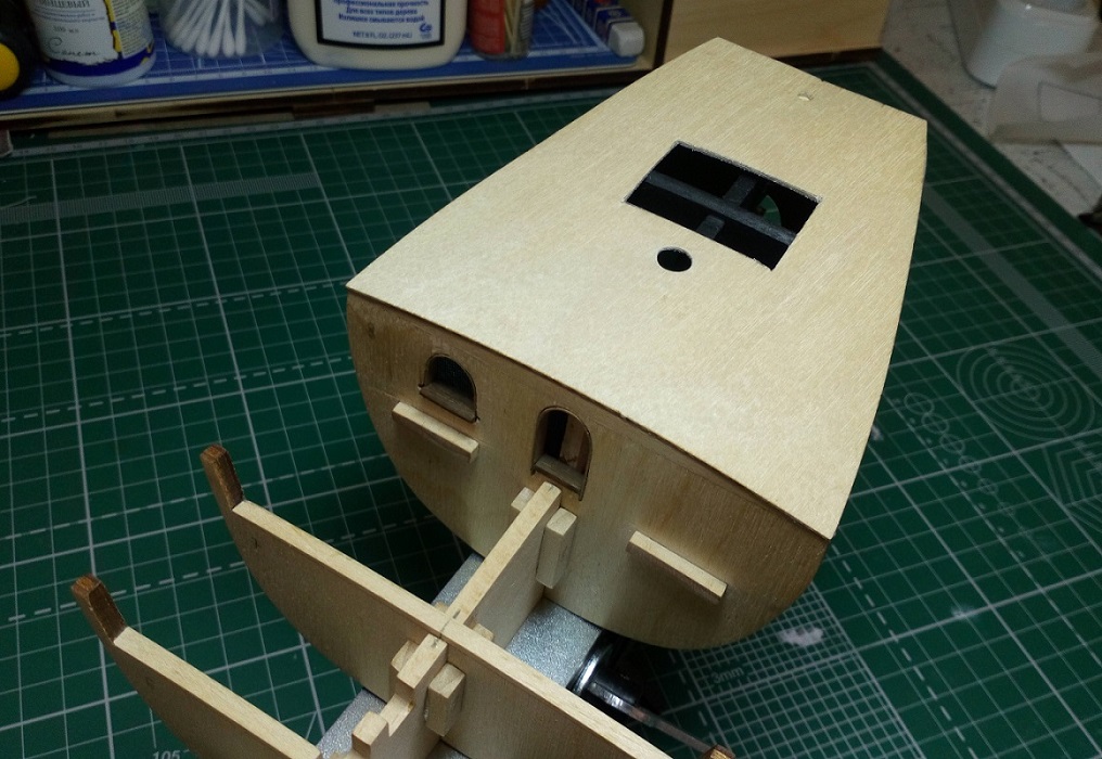 На палубе надстройки (фанера 1 мм) вырезал отверстия под мачты и проем под рустерную решетку.