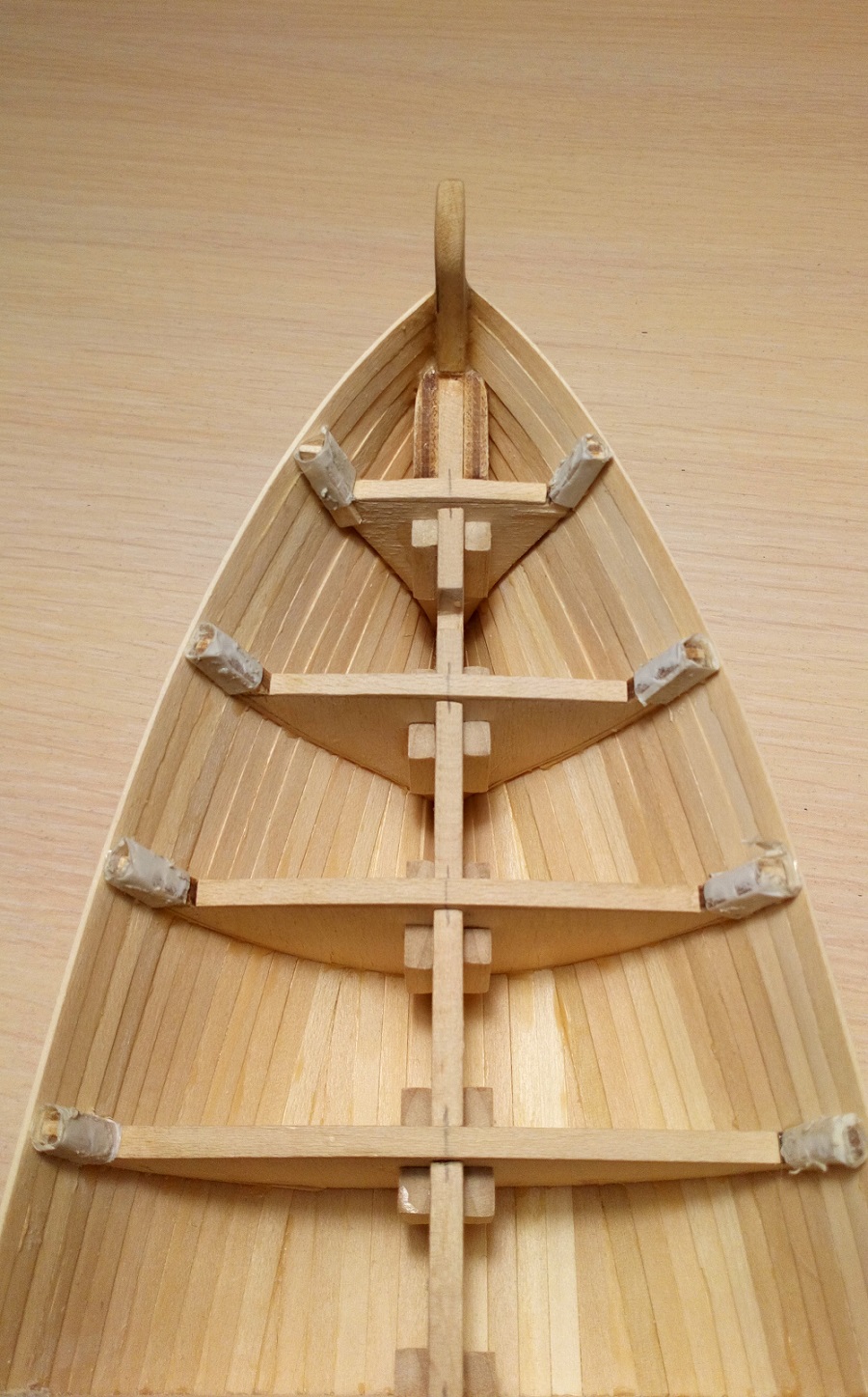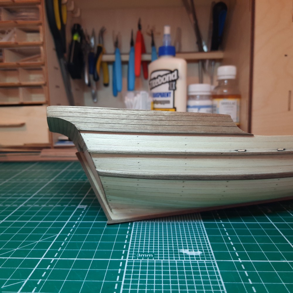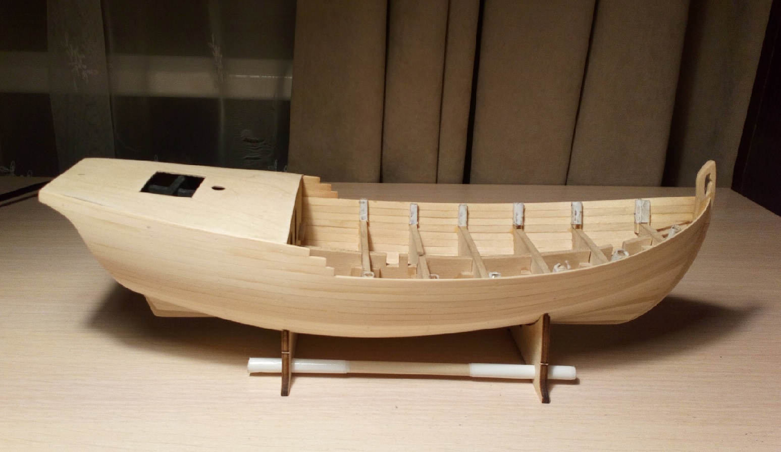 3. По методике обшивки пошел следующим путем. Так как по технологии постройки верхняя часть шпангоутов после обшивки удаляется для установки палубы, то обшивать начал от предполагаемой линии палубы вниз к килю, положил девять поясов без заужения реек, рейки пришлось довольно сильно изгибать, особенно к корме. Далее стал обшивать корпус от киля, еще семь поясов, здесь пришлось гнуть и заужать рейки в обе стороны. В конце обшил фальшборт и надстройку в корме кораблика - еще шесть поясов. В ходе работы рассчитал заужение реек, получилось что нужно заужать 4 мм рейку до 2 мм в корме и носу, что на шпангоутах без заполнения шпаций делать, на мой взгляд, не совсем правильно и практично, поэтому основные пояса положил без заужения, а примыкающие пояса сужал по месту. После установки всех поясов с внутренней стороны прошел корпус тонким слоем клея, который после высыхания стал практически незаметным.