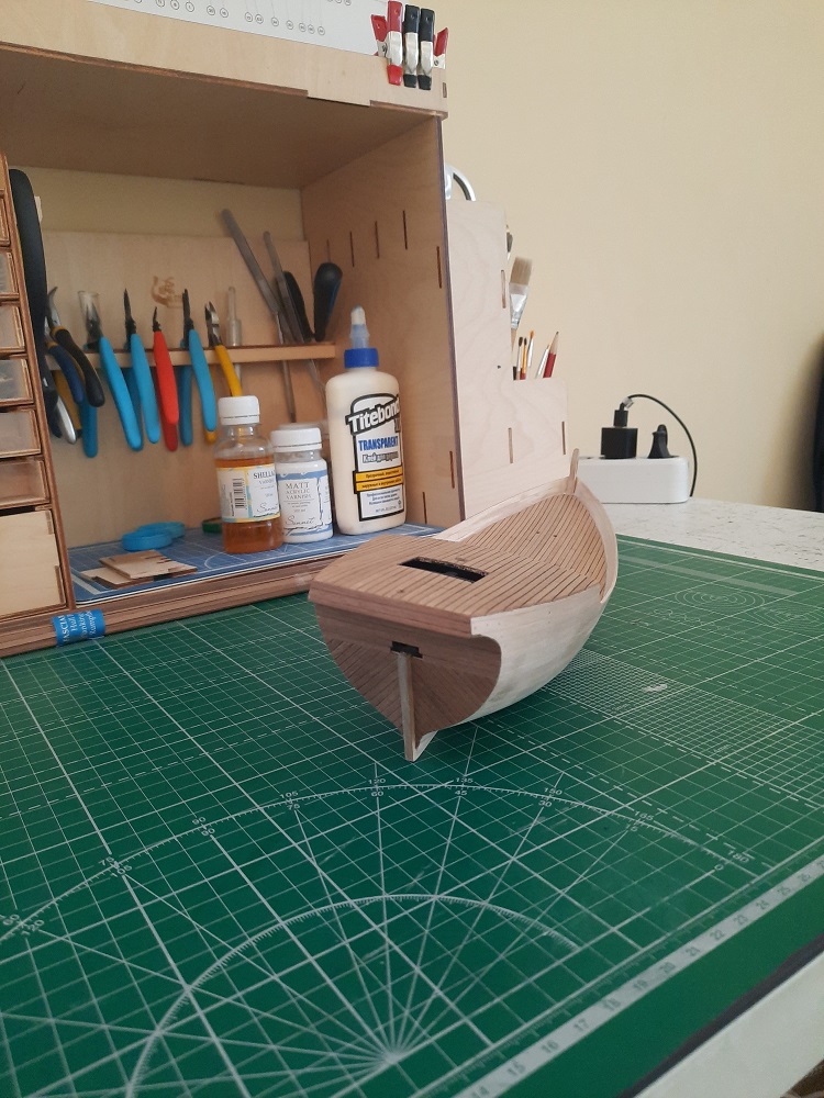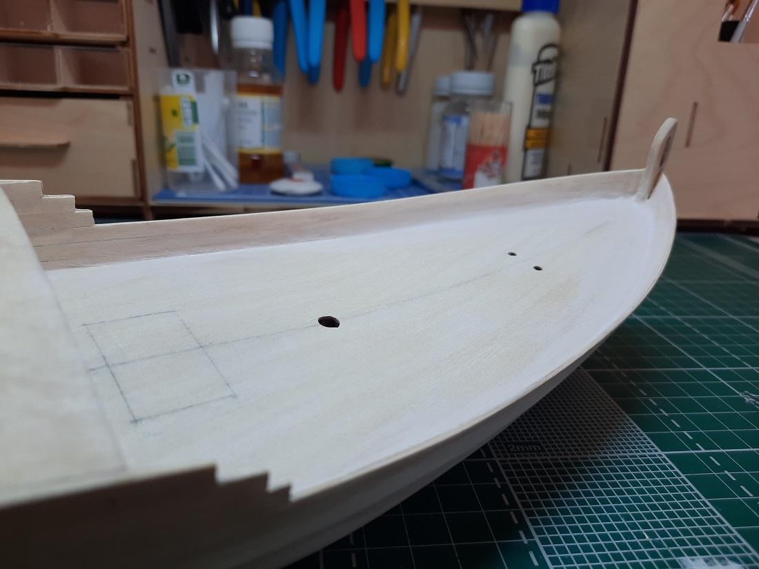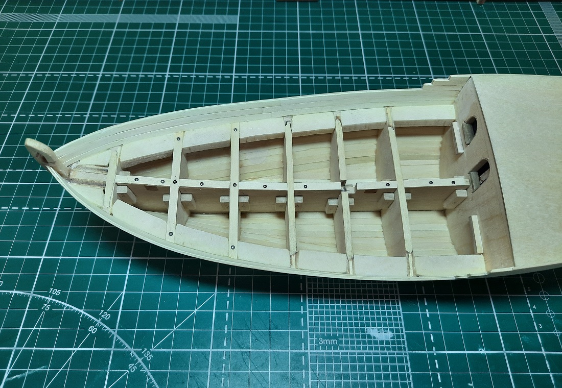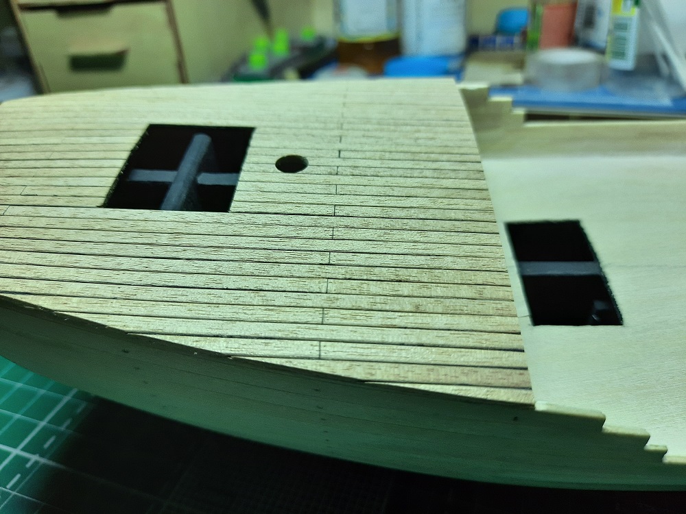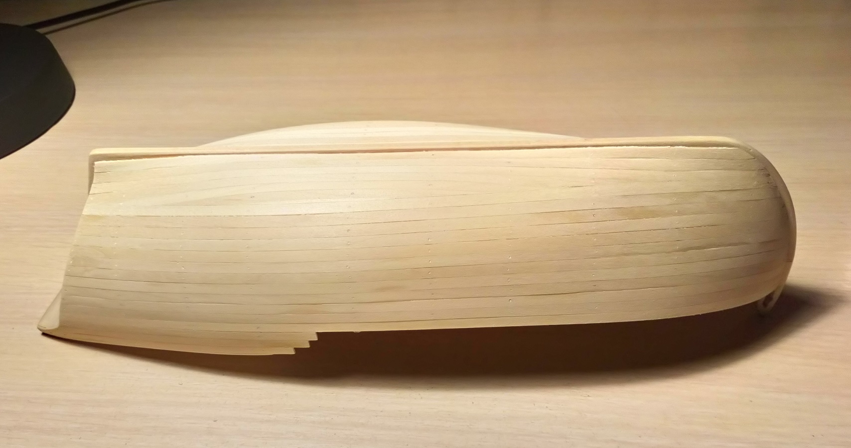 Верхние части шпангоутов (топтимберсы) по технологии постройки корпуса удалены для установки основной палубы. Места вырезов топтимберсов прошпаклеваны, также как и фальшборта (тонким слоем) для придания дополнительной жесткости планкам после удаления поддерживающей части шпангоутов.