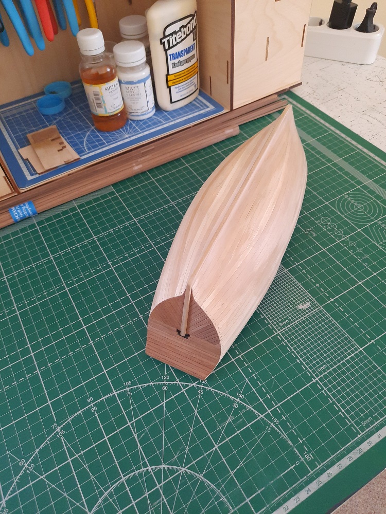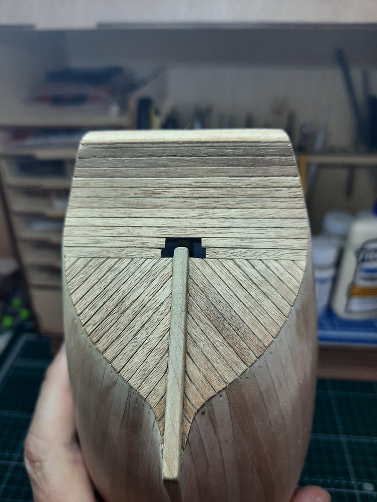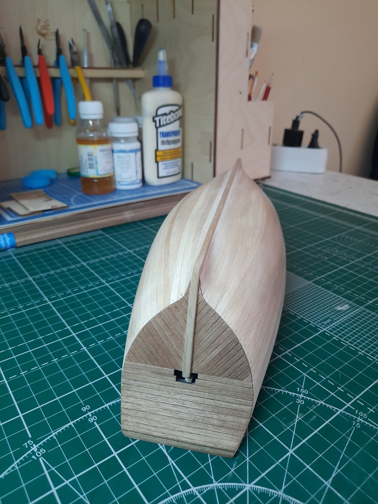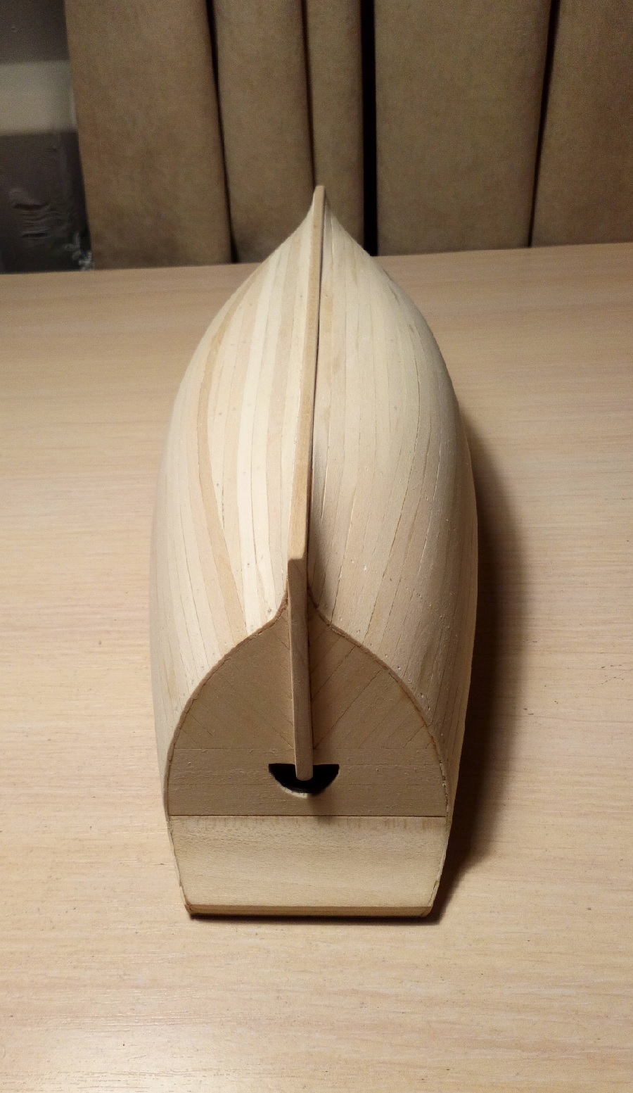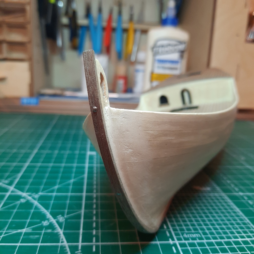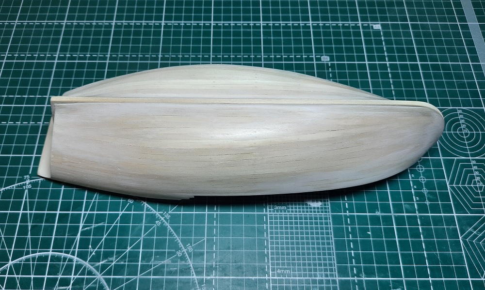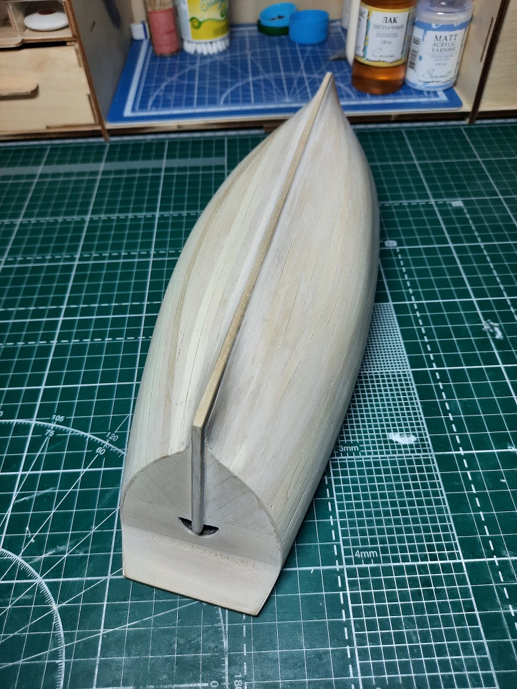 Далее был прошпаклеван с последующей шлифовкой корпус кораблика с внешней стороны, особое внимание уделялось форштевню и килю кораблика.
