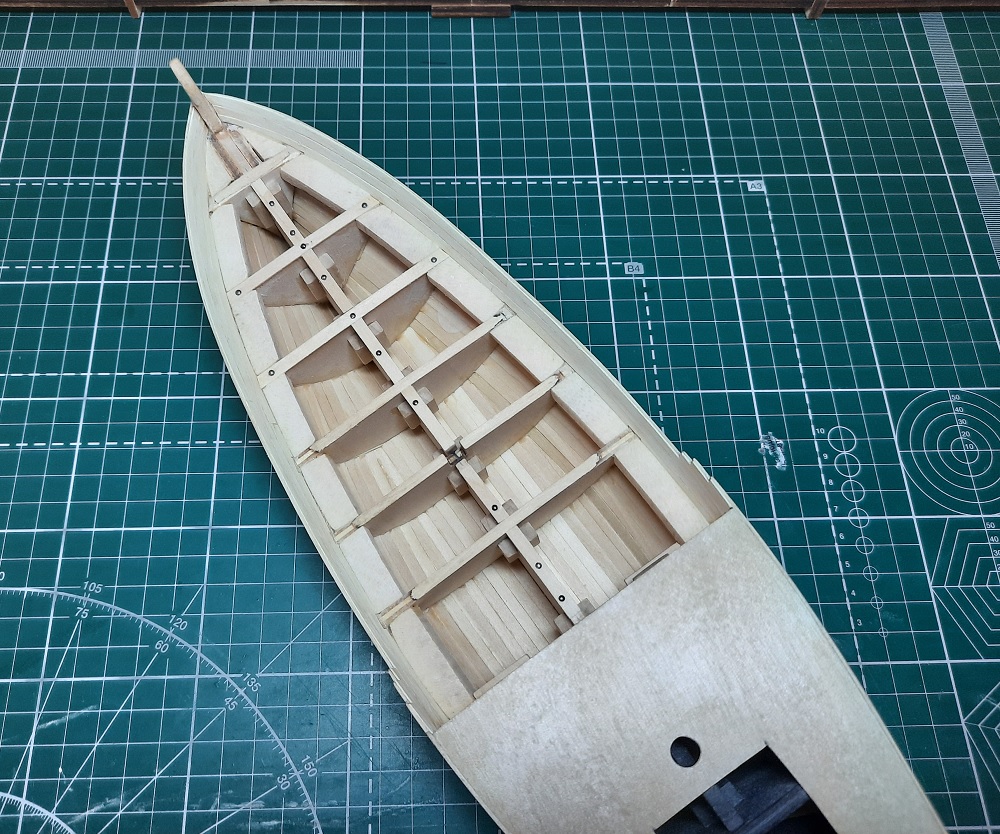 Сделал малковку верхних частей шпангоутов 8-10, покрасил черной краской шпангоуты и килевую рамку под решеткой, приклеил палубу по месту, получился изгиб в двух плоскостях -