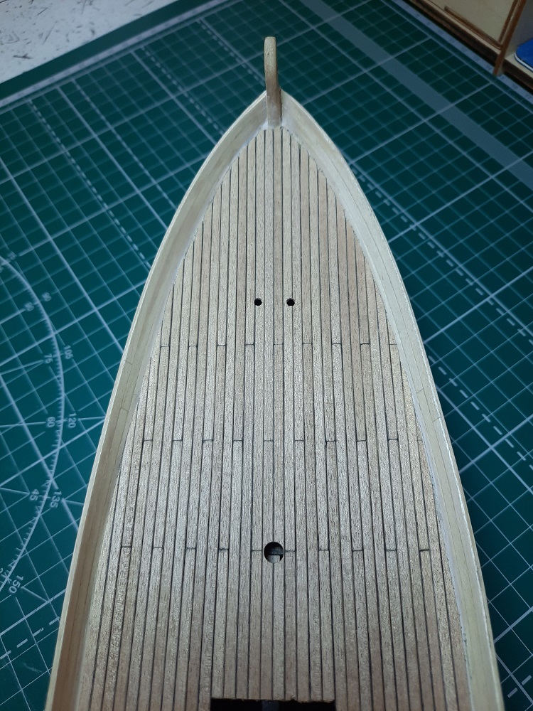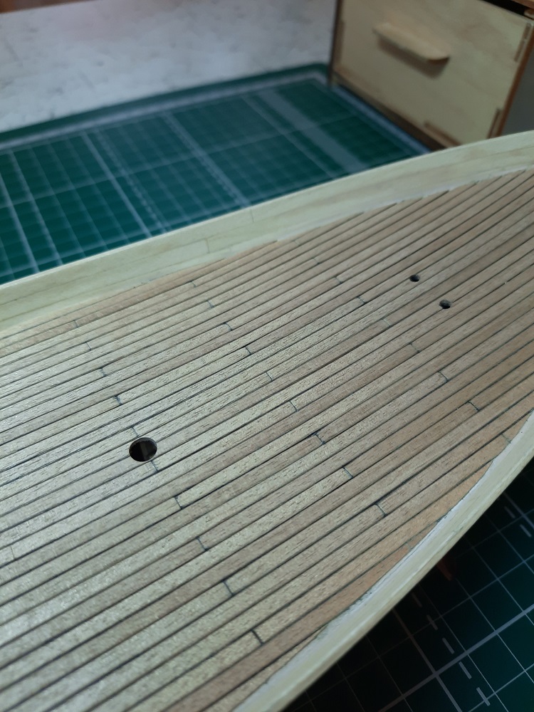 Сделал вариант настила палубы рейками танганьики с имитацией конопатки и наглевания.