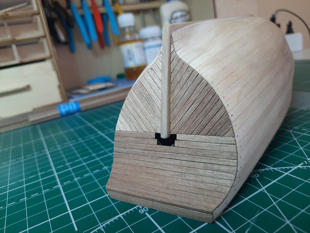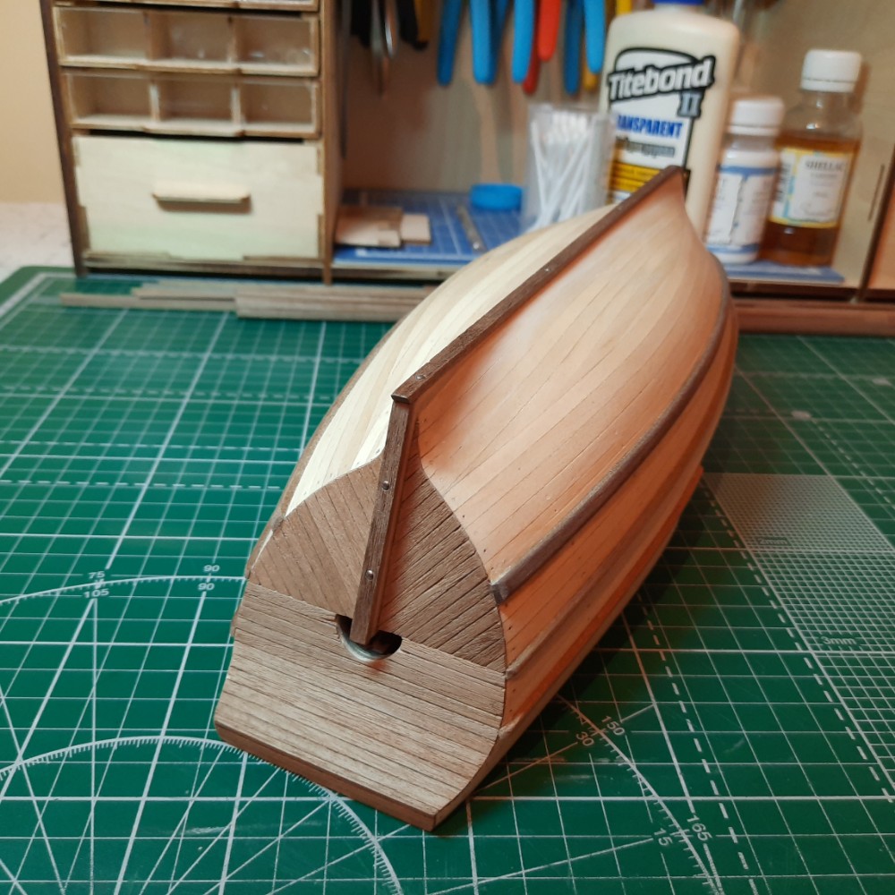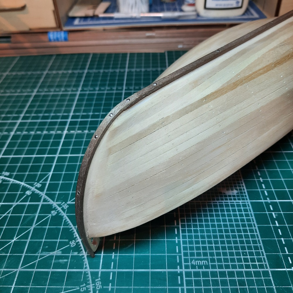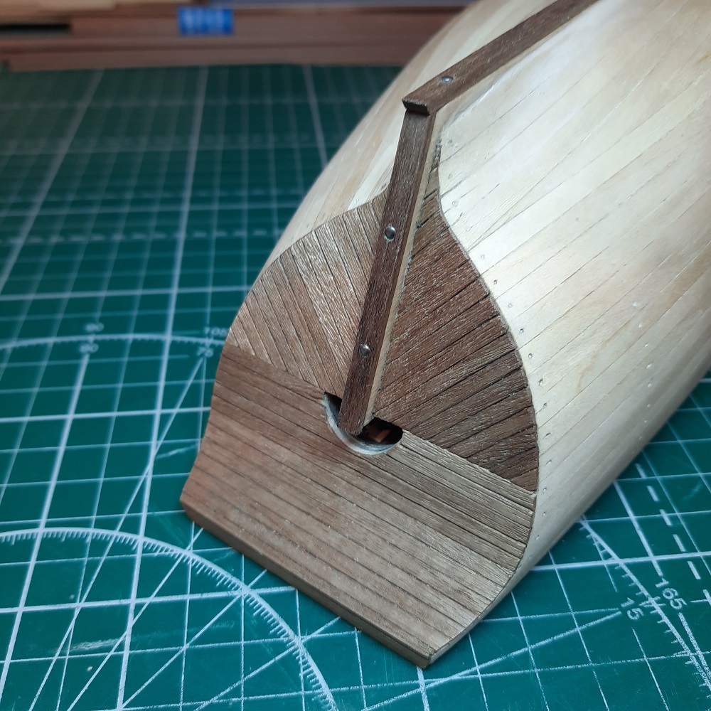 Из рейки темного ореха 2 х 4 мм изготовил форштевень, киль и ахтерштевень. Форштевень имеет крутой изгиб, рейку гнул с помощью паяльника с цилиндрической насадкой вымачивая в воде. На модель клеил клеем Titebond II и скреплял стальными гвоздиками.