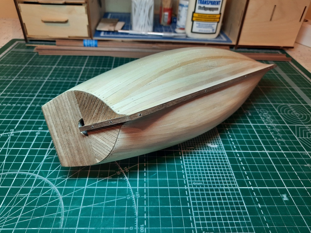 После окончания шпаклевания корпуса обшита для придания прочности внутренняя часть фальшборта липовой рейкой 0,5 x 4 мм (в наборе отсутствует, из своих запасов).