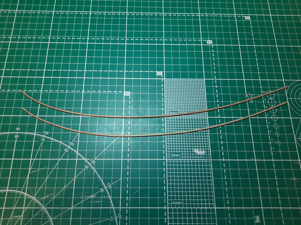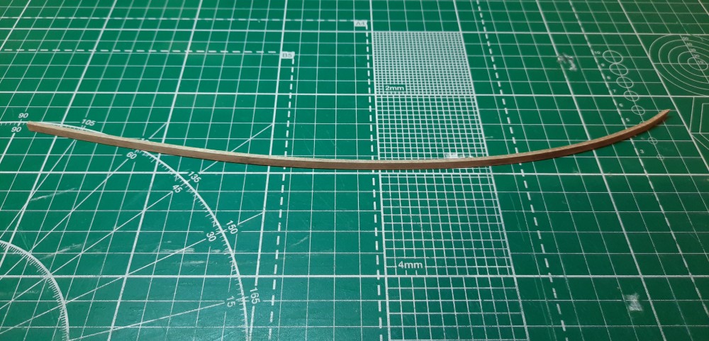 1. Рейки черновой обшивки из липы 1x4 мм отлично гнутся с помощью воды, утюга и ровной деревянной поверхности. Рейку слегка смачивал по всей длине и прогревал утюгом, затем смачивал необходимый участок и с помощью утюга гнул как по плоскости, так и на ребро, и даже винтом. Не сразу, в несколько проходов, но гнется отлично, при обшивке не было сломано ни одной рейки. Качество липовых реек в наборе, на мой взгляд, на высоте.