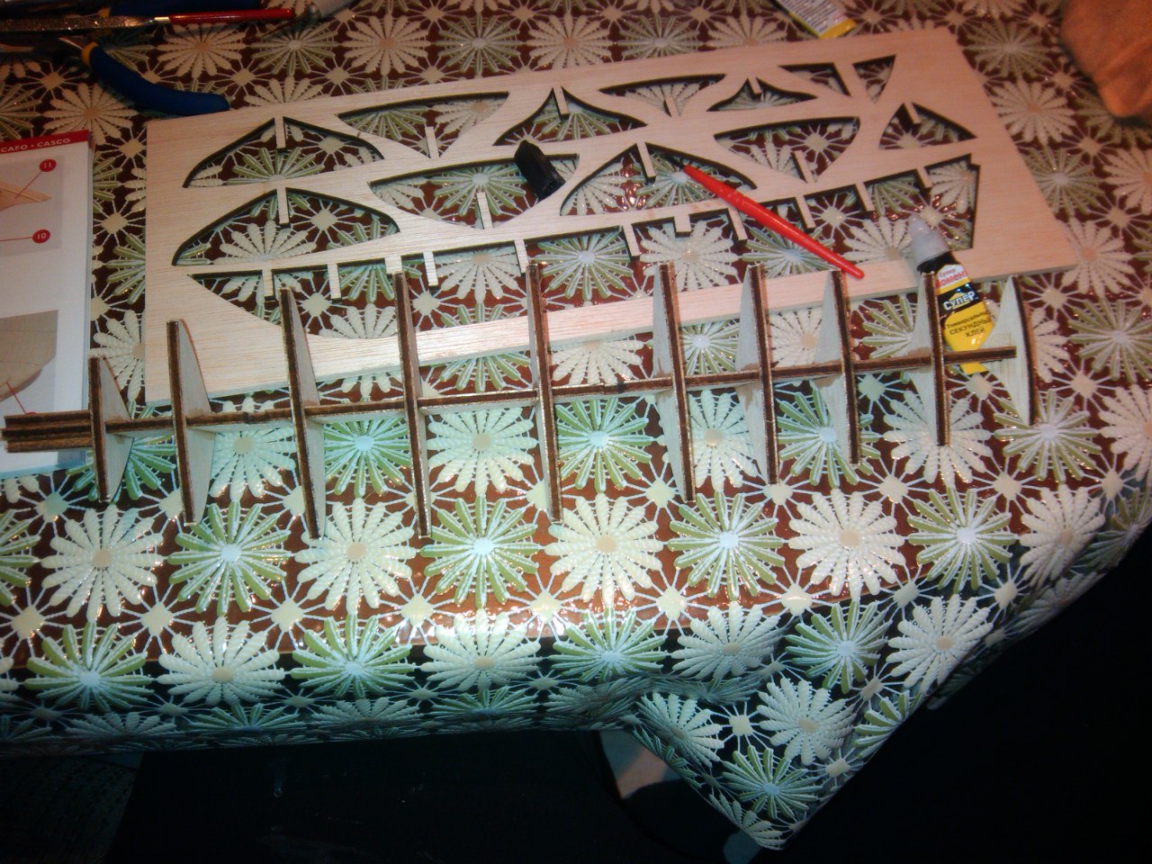 Собрал фальшкиль и шпангоуты. Шпангоуты в фальшкиль входят чересчур свободно и имеется люфт, поэтому приходится тщательно выставлять прямой угол. Клею на супер клей, поэтому поговорка семь раз отмерь - один раз приклей очень актуальна.